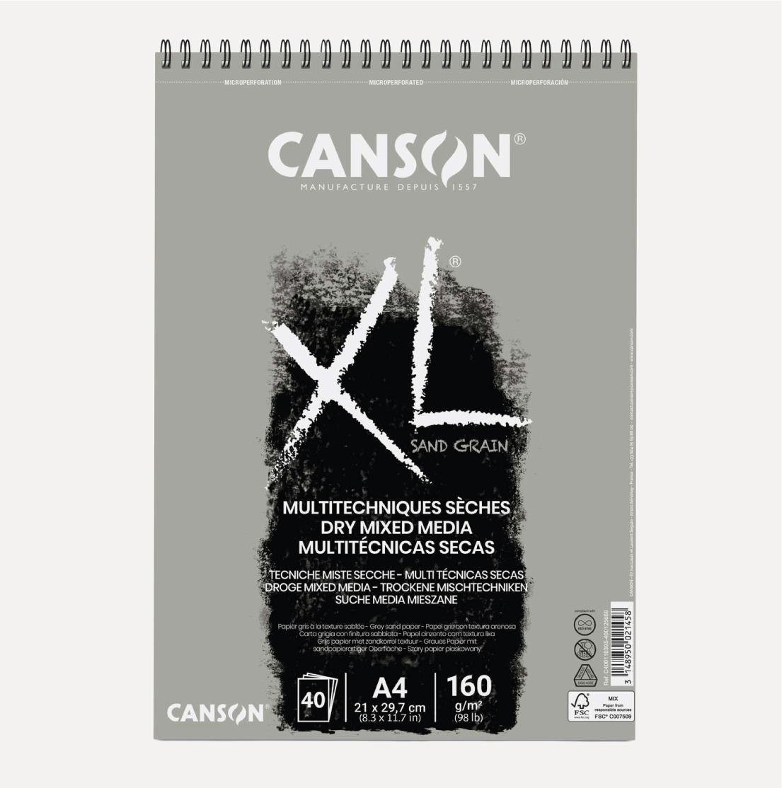 CANSON Blocco XL Mixed Media per tutte le Tecniche SAND GRAIN Grigio. La carta Canson XL Sand Grain è caratterizzata da una superficie vellutata, ottenuta grazie alla presenza di speciali materiali di origine biologica. I pigmenti aderiscono molto bene alla sua superficie (perfetti per effetti cromatici delicati). La carta è resistente, permette cancellature facili e può essere utilizzata su entrambi i lati.