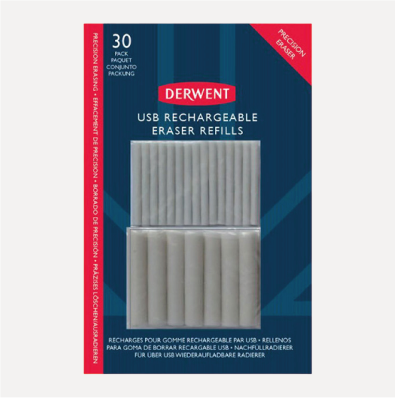 DERWENT ricambi per Gomma elettrica USB. Set di ricarica da 30 pezzi, include 15 gomme grandi da 5 mm e 15 gomme extra sottili da 2,4 mm di diametro. La gomma extra fine è perfetta per la cancellazione dell’attaccatura dei capelli, adatta per opere d’arte dettagliate e disegni tecnici.