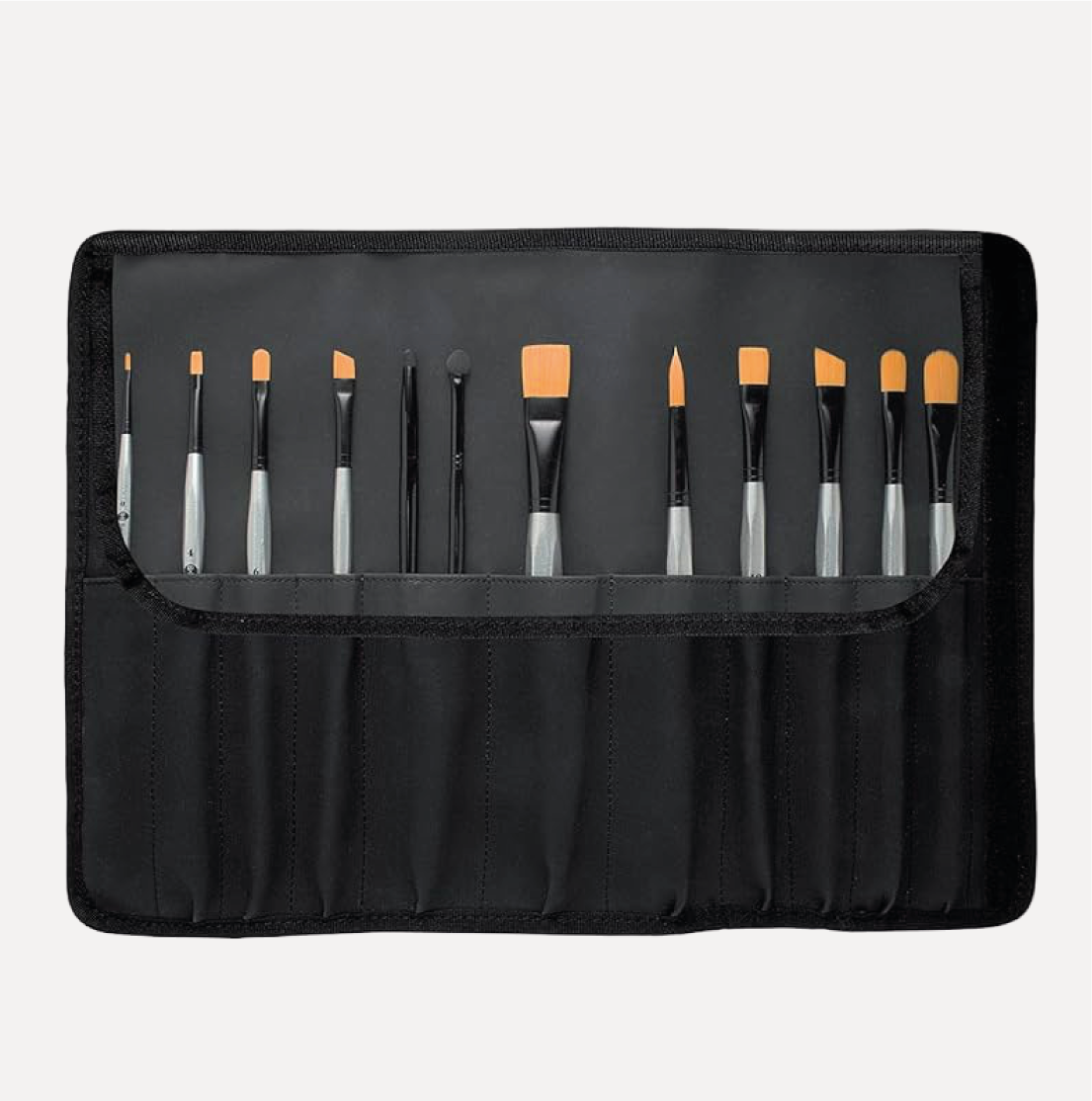 L’astuccio PVC nero è richiudibile e riutilizzabile, perfetto se si desidera potare i propri pennelli sempre con se. È realizzato in simil pelle nera con patta protettiva in plastica con velcro, garantendo una buona comodità e un incredibile manegevolezza. All’interno dell’astuccio sono contenuti 12 pennelli, nello specifico: