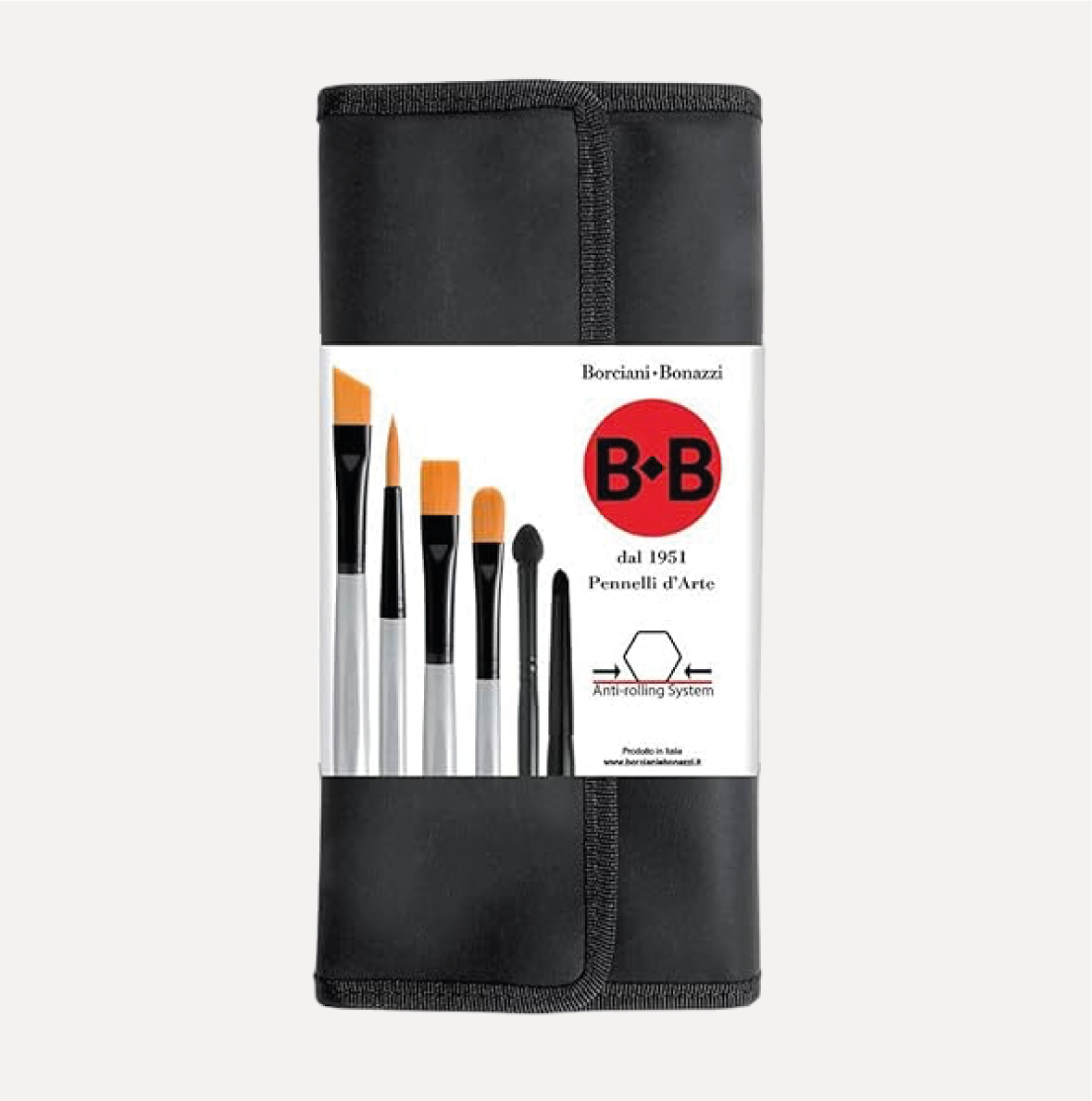 BORCIANI e BONAZZI Kit Astuccio con 12 Pennelli Sintetici. Set con 12 Pennelli! L’astuccio PVC è di colore nero, richiudibile e completamente riutilizzabile. All’interno del kit sono presenti sono presenti 12 pennelli sintetici esagonali