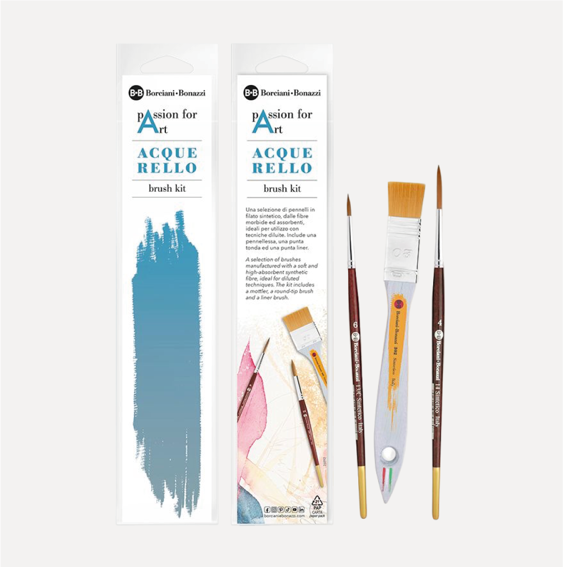 BORCIANI e BONAZZI Passion for Art ACQUERELLO Set 3 Pennelli. Contiene una selezione di 3 pennelli in filati sintetici dalle fibre morbide e sottili, a lento rilascio d’acqua che permettano lavorazioni su carta bagnata senza graffiarla e tratti lunghi e definiti.
