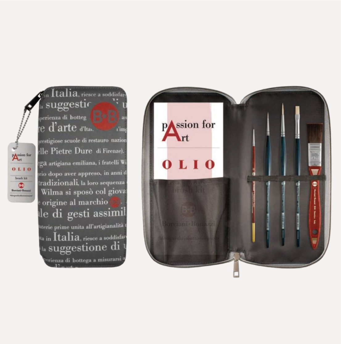 BORCIANI e BONAZZI Passion for Art OLIO Astuccio con 5 Pennelli.Contiene una selezione di pennelli in filato sintetico adatti a movimentare la materia spessa e corposa della pittura ad olio: fibre grandi e tenaci, nate dall’imitazione della tradizionale setola, che lasciano una evidente traccia pittorica e permettono di creare la vostra opera dall’inizio alla fine. Include una pennellessa.