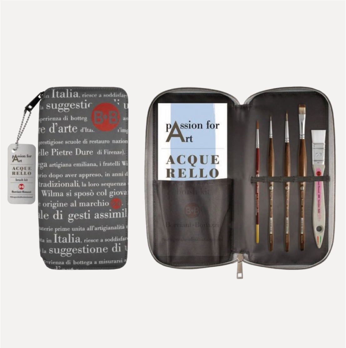 BORCIANI e BONAZZI Passion for Art ACQUERELLO Astuccio con 5 Pennelli. Set composto da una selezione di 5 pennelli in filati sintetici con fibre morbide e sottili, a lento rilascio d’acqua che permettano lavorazioni su carta bagnata senza graffiarla, facilitando la realizzazione di tratti lunghi e definiti.
