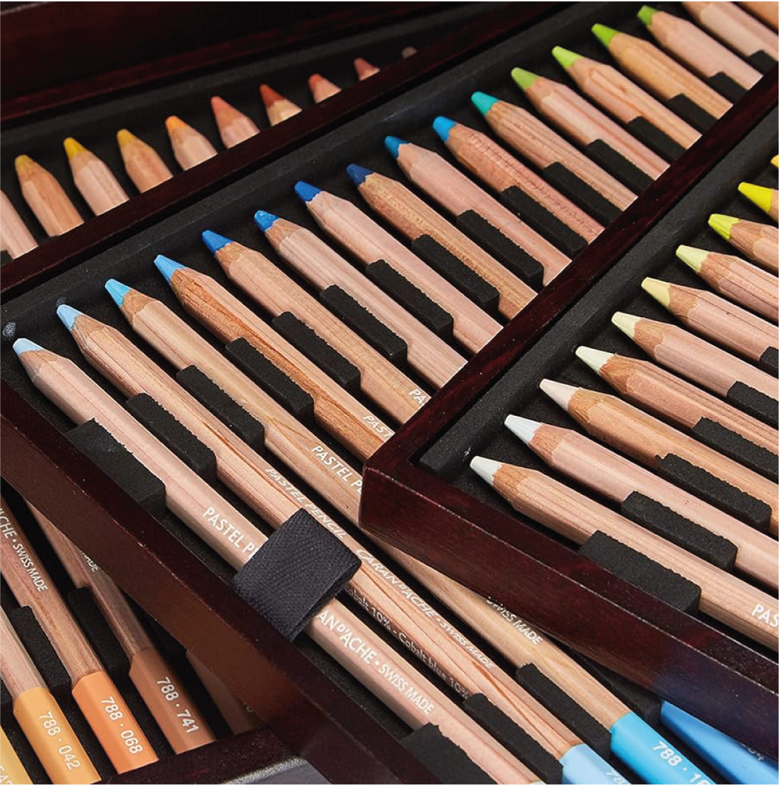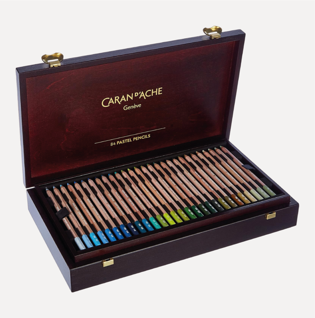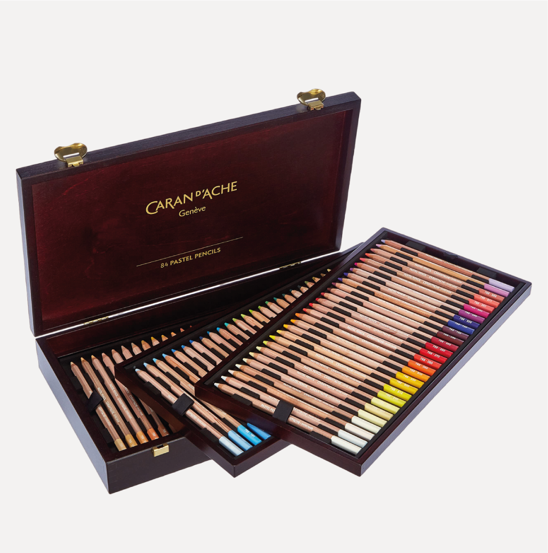 CARAN D’ACHE Matite colorate PASTEL PENCIL – Cassetta in Legno. 84 colori! Fantastico punto di incontro tra i pigmenti puri, tipici dei pastelli secchi, e la comodità d’uso che contraddistingue le matite colorate. La valigetta, realizzata in legno, contiene al suo interno la gamma completa, composta da 84 tonalità.