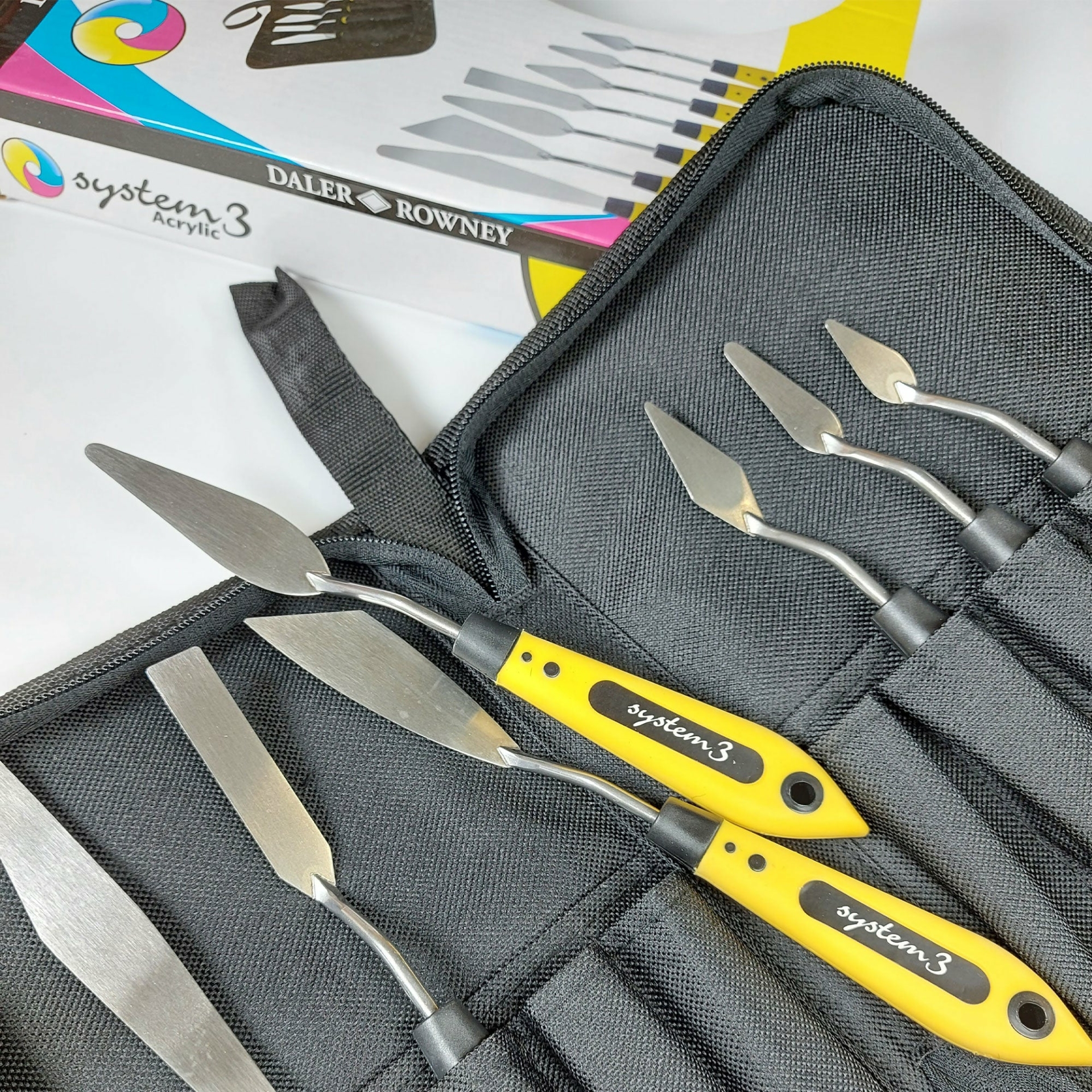 DALER ROWNEY SYSTEM3 Astuccio 7 Spatole in metallo. Bellissimo astuccio richiudibile con zip contenente 7 spatole! ideali per colori Acrilici, ad Olio e in generale creare effetti 3D, dipingere, stendere gesso e colore o semplicemente per miscelare e snervare i colori.