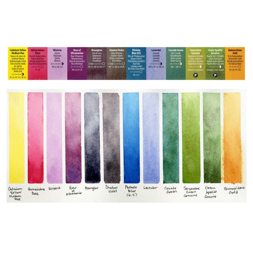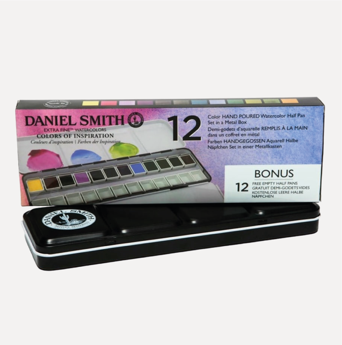 DANIEL SMITH Colori Acquerello Professionali Set metallo 12 Godet INSPIRATION. Bellissima confezione in metallo laccato nero all’esterno e bianco all’interno per una facile pulizia contiene 12 colori versati a mano del fantastico acquerello extrafine Daniel Smith, inoltre include altri 12 mezzi godet da riempire dei tuoi colori preferiti!