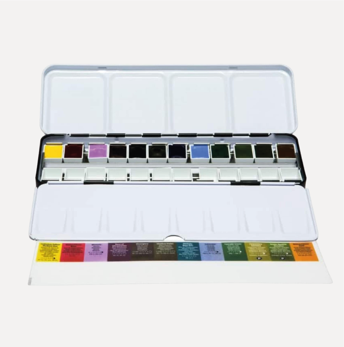 Questa bellissima confezione in metallo laccato nero all’esterno e bianco all’interno per una facile pulizia contiene 12 colori “versati a mano” del famosissimo acquerello extrafine Daniel Smith, inoltre include 12 scomparti vuoti da riempire con i tuoi colori preferiti!