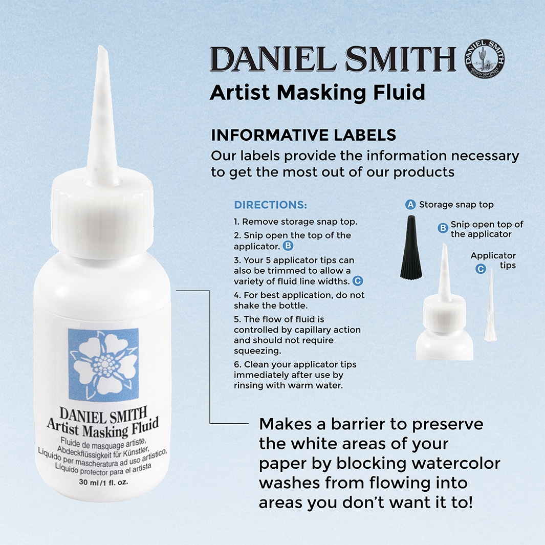 +DANIEL SMITH Lattice per Mascheratura. Il fluido per mascheratura agisce come una barriera impermeabile per l’acquerello. La caratteristica principale del Masking Fluid di Daniel Smith è la sua estrema semplicita di utilizzo. Il flacone è comprimibile ed è possibile sfruttare 5 diversi applicatori a punta fine.