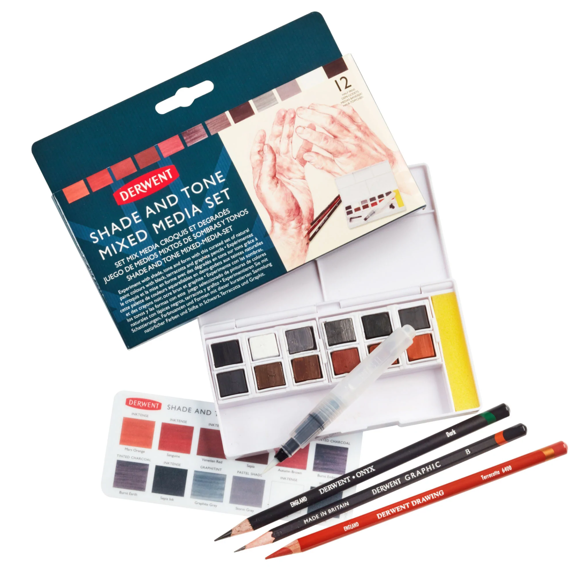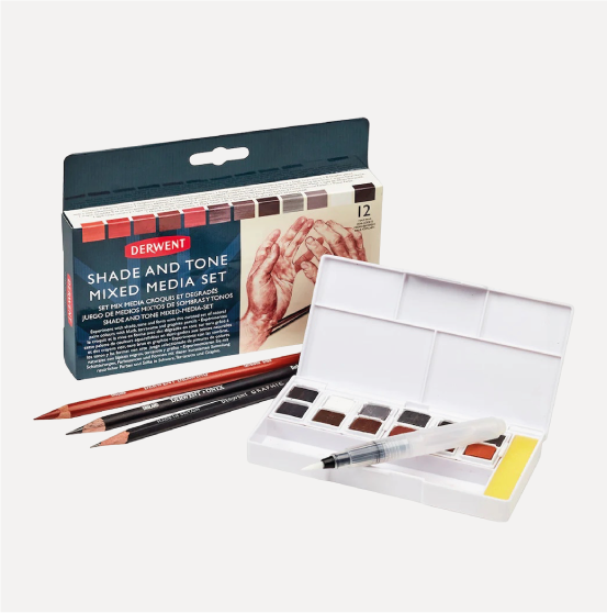 Derwent Set di acquerelli “Shade and Tone” Set contenente 12 godet ( 7 Inktense, 2 Graphitint, 1 Pastel, 2 Tinte Charcoal), tre matite e un pennello con serbatoio.