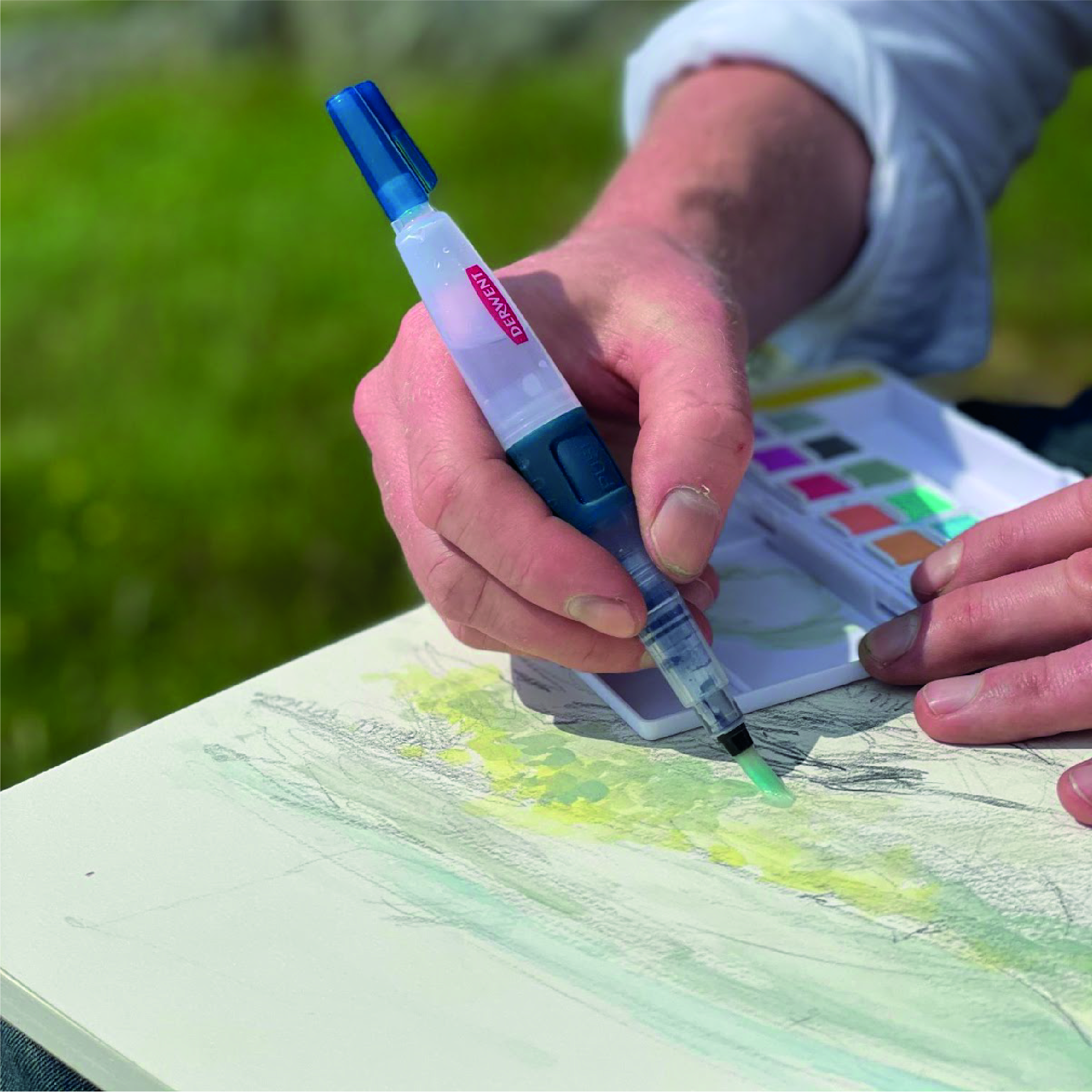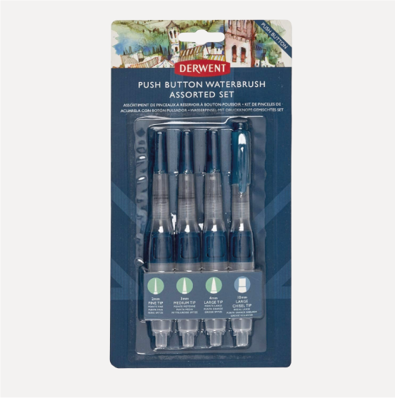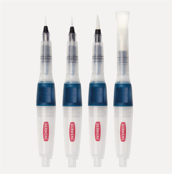 DERWENT Set 4 Pennelli con serbatoio. Set di pennelli a punte miste con serbatoio. I pennelli perfetti per viaggiare o per schizzi spontanei! Sostituisci la tua tazza d’acqua con questi pennelli!