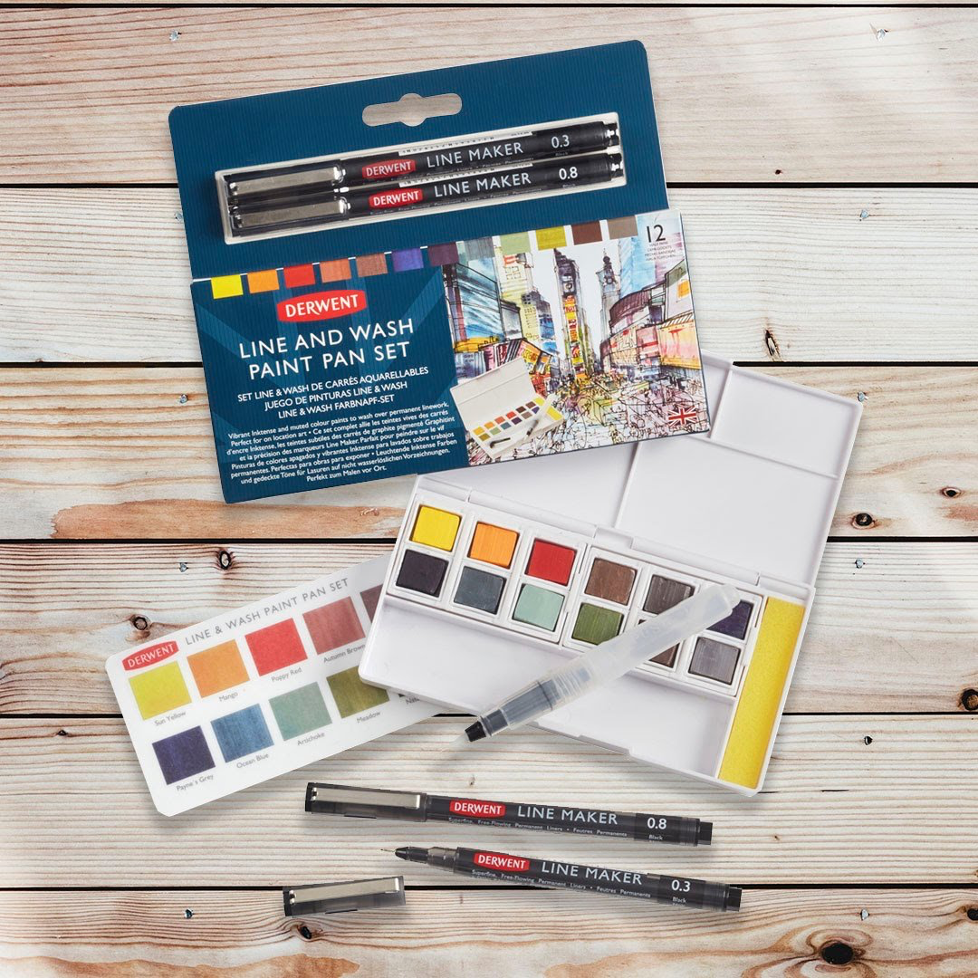 Derwent Set di acquerelli “Line&Wash” Set contenente 12 godet ( 6 Inktense, 4 Graphitint, 2 Pastel), due pennarelli liner e un pennello con serbatoio, insomma tutto l’occorrente per i tuoi disegni “urban” e per i tuoi Sketch!