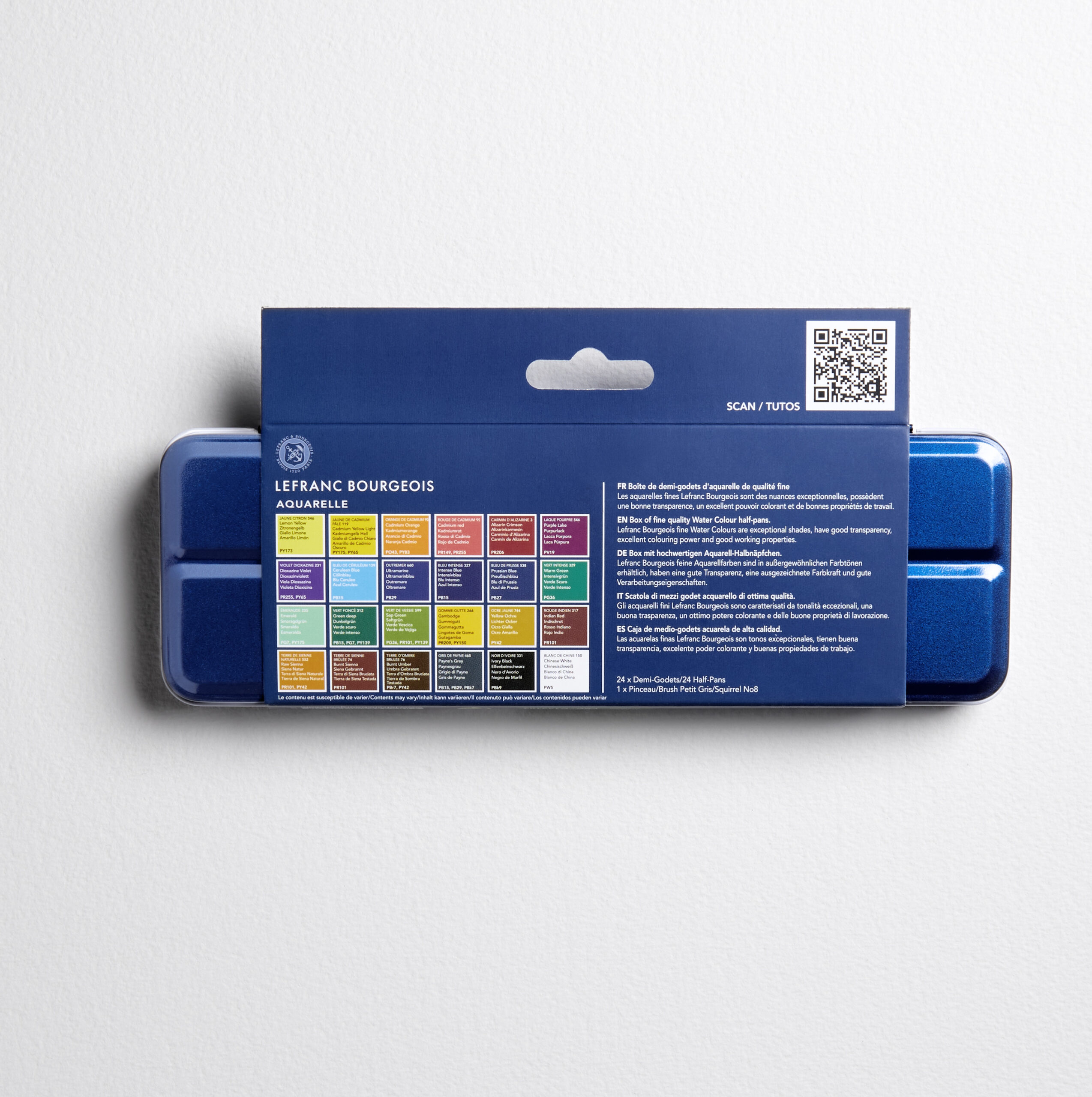 LEFRANC & BOURGEOIS Acquarello Fine set 24 Mezzi Godet. Gli Acquerelli serie Fine di Lefranc & Bourgeois sono colori studio carichi di pigmenti, luminosi e resistenti alla luce. La gamma è stata recentemente innovata trovando nuove formulazioni di pigmenti, grazie agli oltre 300anni di esperienza nella produzione di colori per artisti di Lefranc & Bourgeois
