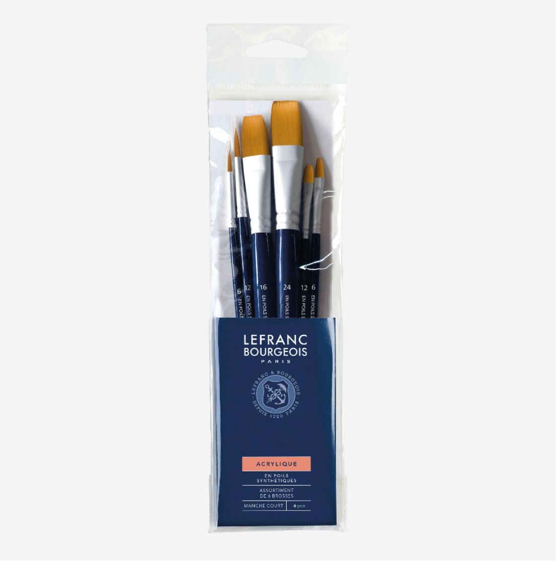 LEFRANC & BOURGEOIS Set 6 pennelli sintetici. Forniscono un’ottima elasticità sulla tela e un tocco molto preciso e vigoroso. Nel set un tondo n°6, un tondo n°12, un filbert n°6, un filbert n°12, un piatto n°16 e un piatto n°24