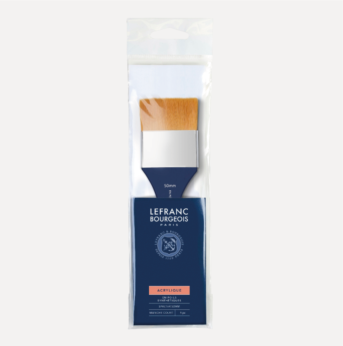 LEFRANC & BOURGEOIS Pennellessa Setole Sintetiche. Questo blister contiene una pennellessa da 50mm (spalter) a manico corto in fibra sintetica dorata. Indicata per la pittura acrilica e olio, fornisce un’eccellente elasticità sulla tela, ideale per realizzare sfondi uniformi.