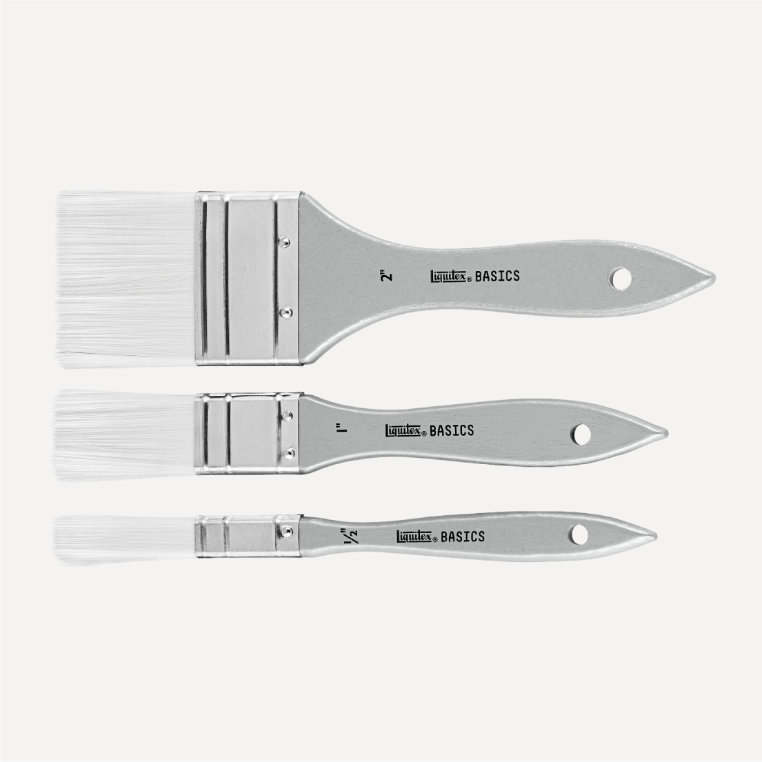 LIQUITEX Set 3 Pennellesse BASICS. I pennelli Basics di Liquitex sono realizzati in setole sintetiche Nylon flessibili e resistenti! Ideali per colori liquidi e pastosi sono durevoli e si puliscono facilmente. Nel set sono inclusi una pennellessa da 1/2″- 1″ – 2″.