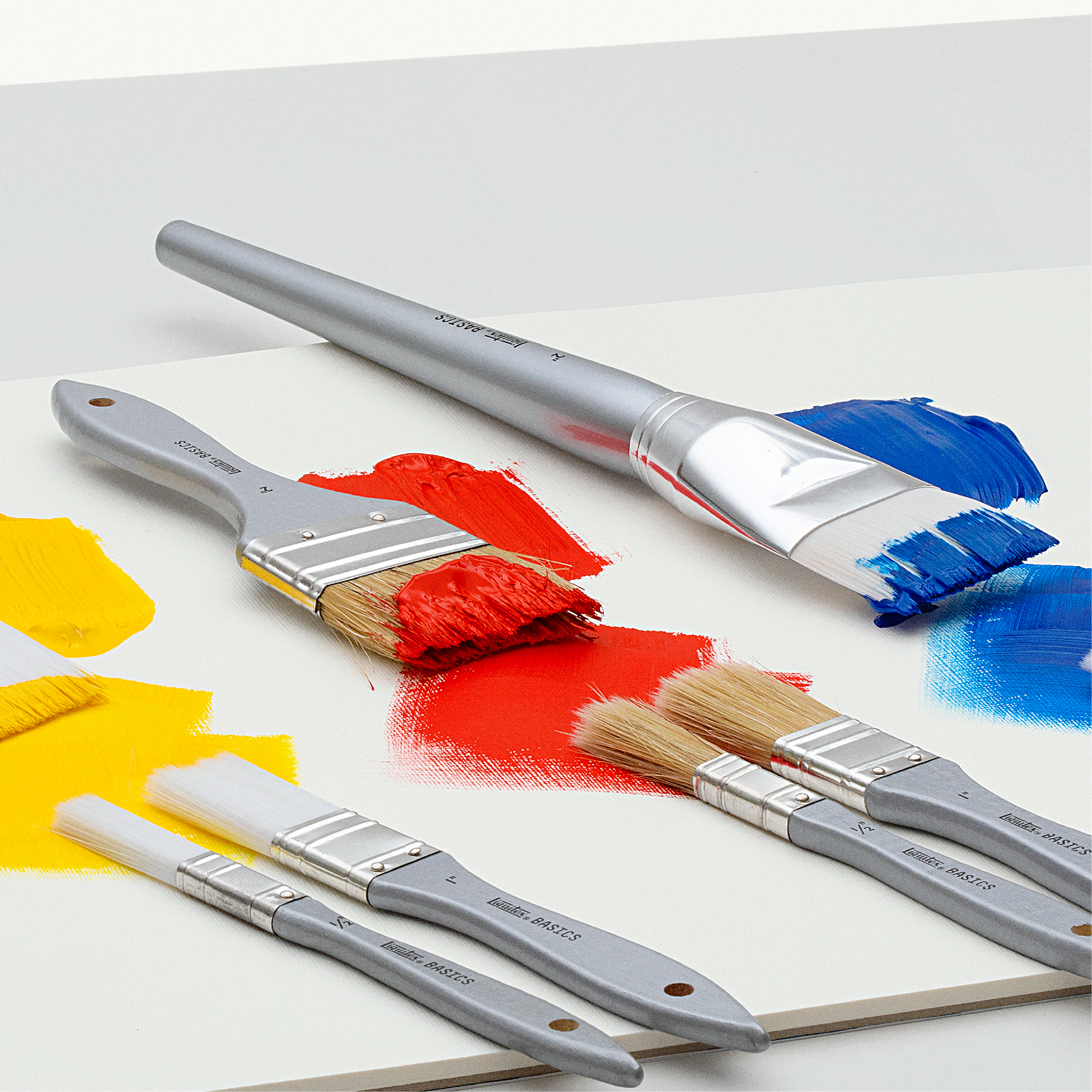 Progettati per l’uso con colori e mezzi acrilici, questi pennelli con le sue cinque forme ti accompagneranno dalla stesura ai dettagli finali e ad ogni fase intermedia. Sono realizzati con setole sintetiche medio-morbide e manici lunghi e lisci, i pennelli Basics sono facili da pulire, super resistenti e trasportano un buon carico di colore.