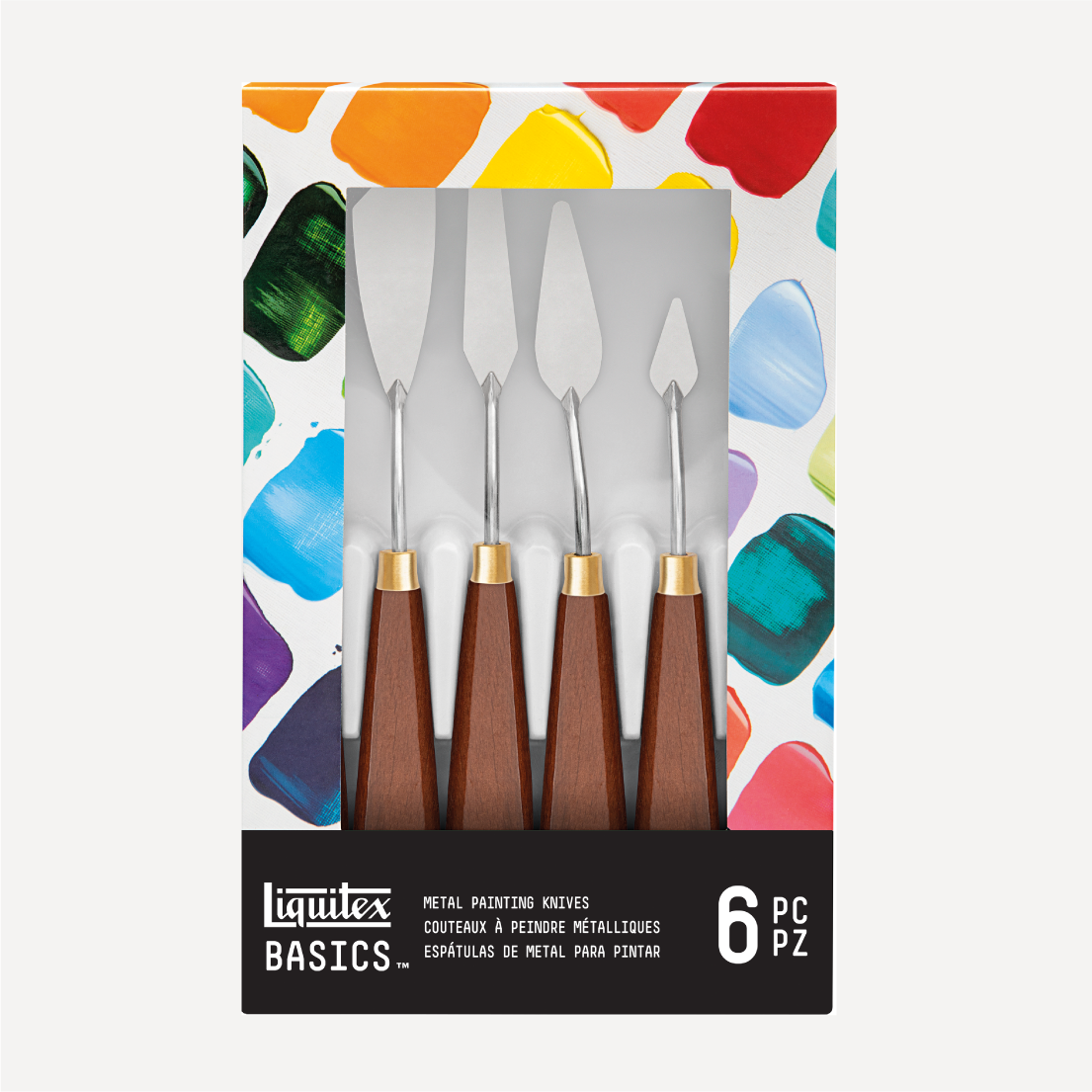 LIQUITEX Basics Set 6 Spatole in metallo. Le Spatole Basics di Liquitex hanno lame flessibili di acciaio inox di alta qualità con manico in legno certificato FSC, ideali per colori Acrilici, ad Olio e in generale creare effetti 3D, dipingere, stendere gesso e colore o semplicemente per miscelare e snervare i colori.