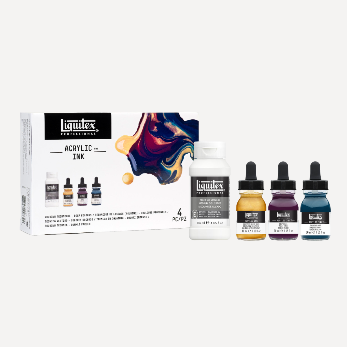 LIQUITEX ink set Tecnica a colatura Colori Scuri. Set di 3 Flaconi da 30 ml + Pouring Medium 118ml. Scopri l’Inchiostro Acrilico professionale ultra fluido. Sviluppato esclusivamente per effetti colati e pittura a flusso, questo set include un medium e tre colori profondi che funzionano come una tavolozza tonale.
