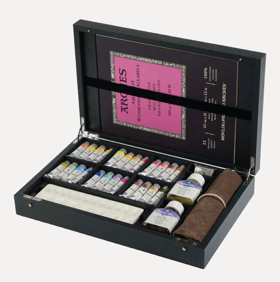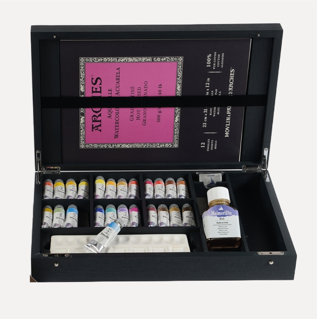 MAIMERI Colori Acquerello Maimeri Blu Cassetta in Frassino 24 Tubetti . Colori superiori, formulati con pigmenti puri, che si distinguono per la grande trasparenza, la freschezza e la luminosità. Confezione da 24 tubetti da 12 ml, 1 Medio al miele 75ml, 1 Fiele di bue naturale 75ml, 1 tavolozza in porcellana, 1 astuccio in tessuto resistente per accessori con 4 pennelli Neptune di Princeton e 5 matite Lyra in grafite varie graduazioni, 1 gomma pane e 1 blocco da 12 fogli di carta 300 g/mq grana satinata Arches.
