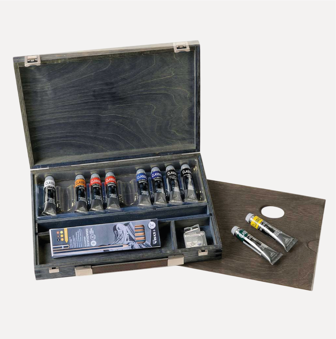 MAIMERI Olio CLASSICO Cassetta VINTAGE 10 Tubi 20ml. La scelta ideale per chi si avvicina alla pittura a olio. Contiene 10 tubetti da 20ml, un set graphite Lyra, una gomma pane e un temperamatite, il tutto racchiuso in un’elegante confezione, perfetta per iniziare con qualità e convenienza.