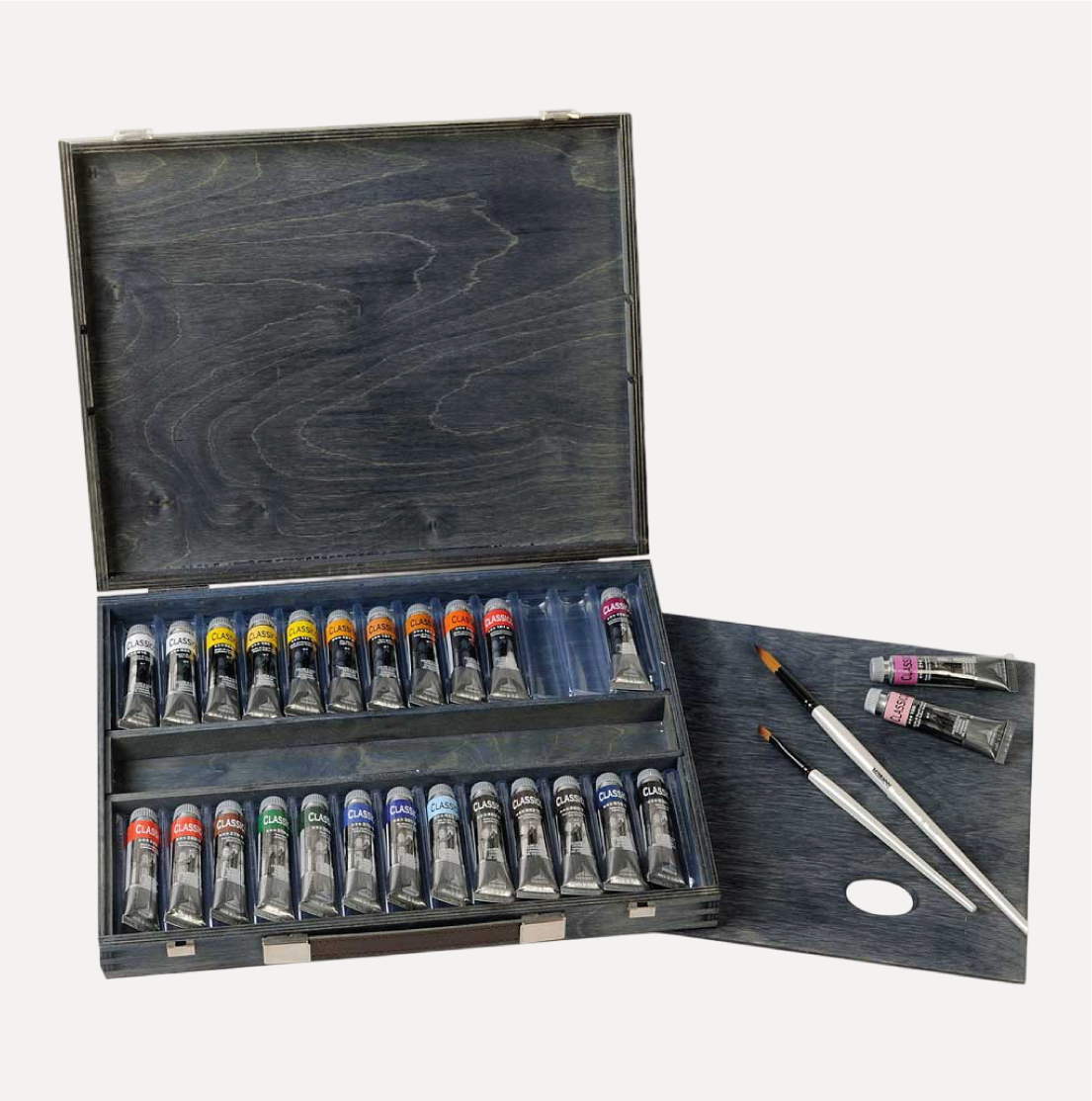 MAIMERI Olio CLASSICO Cassetta VINTAGE 26 Tubi 20ml . La scelta ideale per chi si avvicina alla pittura a olio. Contiene 26 tubetti da 20ml, un set graphite Lyra, una gomma pane e un temperamatite, il tutto racchiuso in un’elegante confezione, perfetta per iniziare con qualità e convenienza.