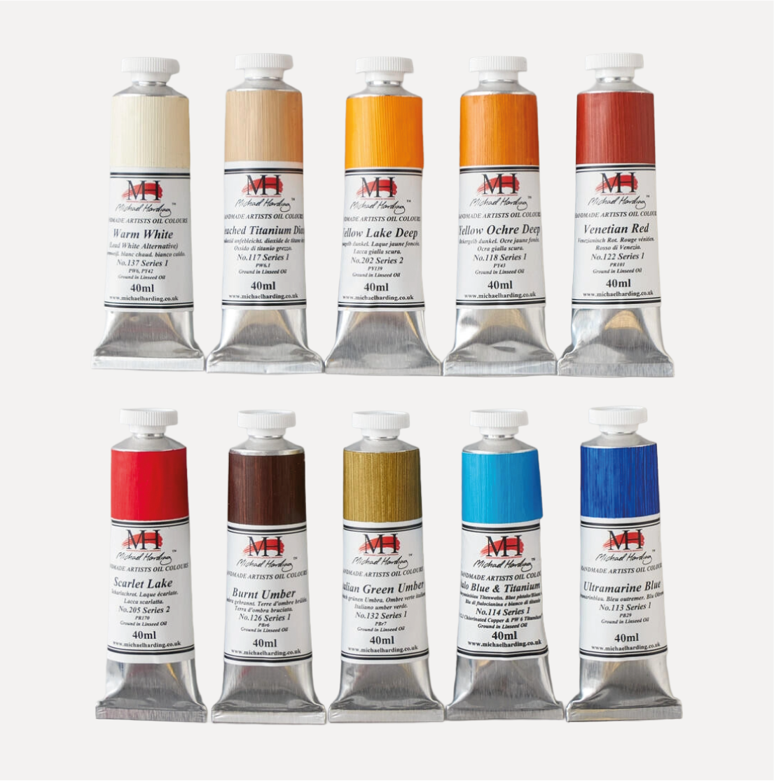 +MICHAEL HARDING colori a Olio DESERT SET. I colori a Olio di Michael Harding sono fatti a mano e hanno un potere di tinta, concentrazione e saturazione incredibile! Questo set è composto da 10 tubetti da 40ml.