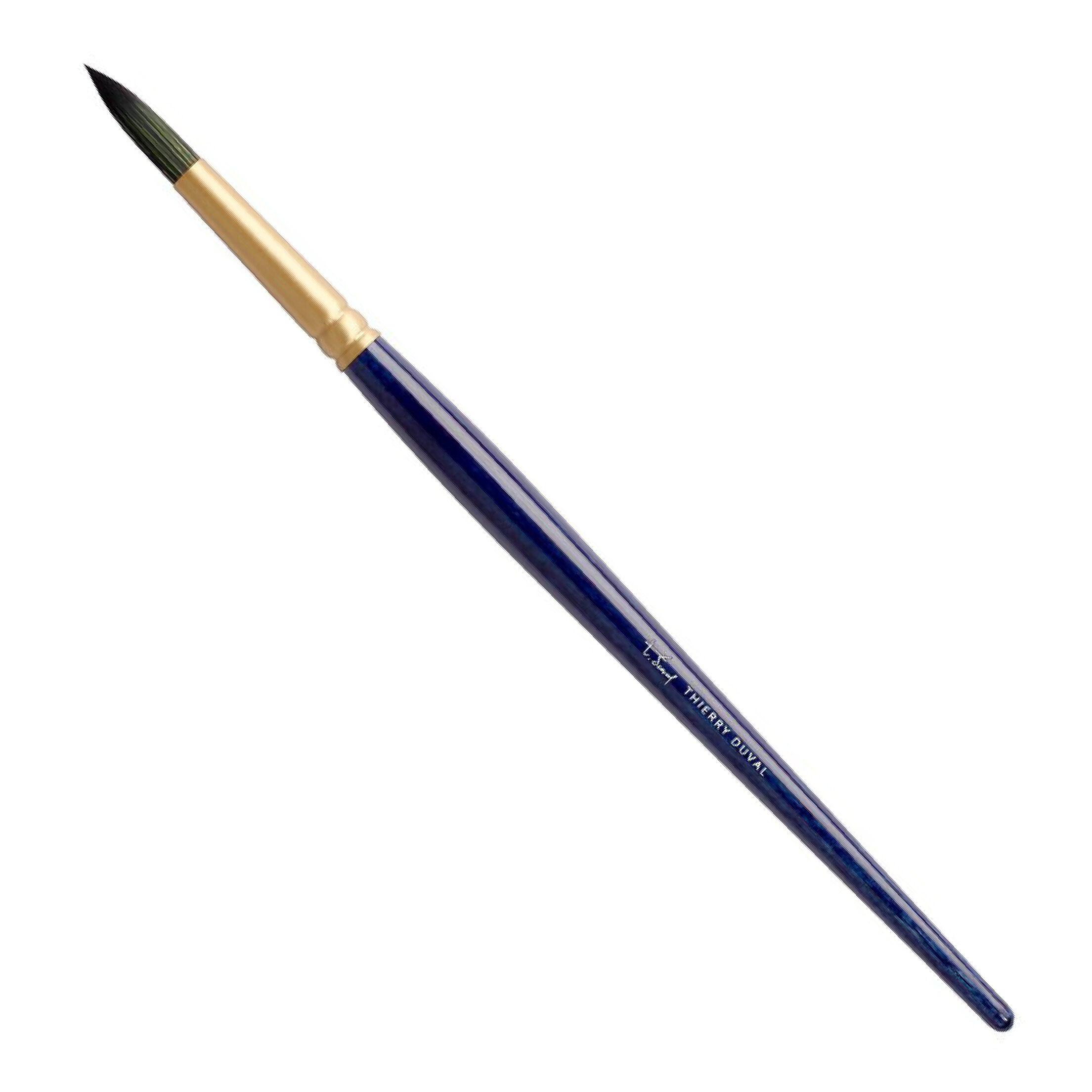 TINTORETTO Pennello Tondo Thierry Duval TD02. Della serie d’Autore del grande Acquerellista Thierry Duval nasce questo pennello tondo sintetico Smeraldo. Ghiera in ottone colore oro e manico di legno verniciato blu. La forma della testa e della punta sono espressamente create per ottenere un tratto sottilissimo. Misura 14
