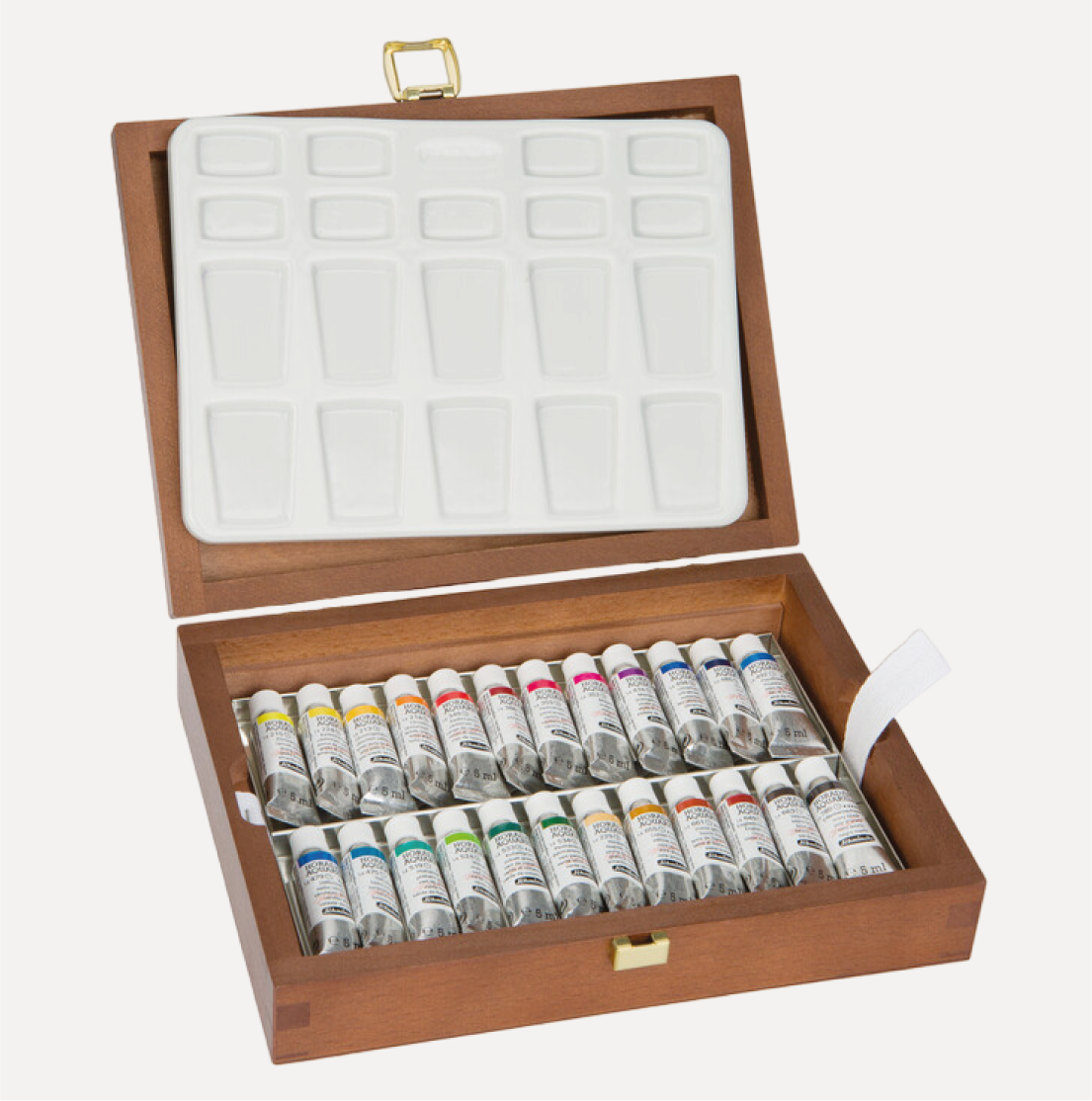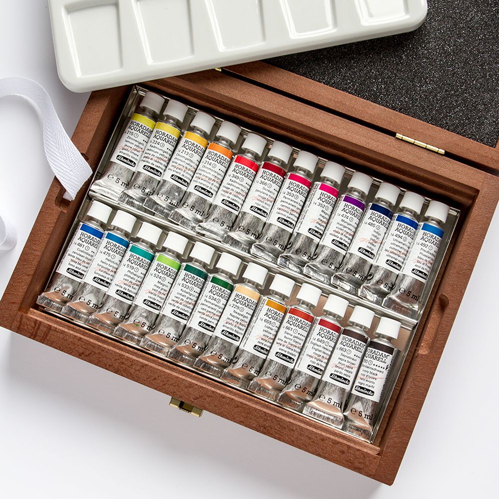 SCHMINCKE Colori Acquerello Horadam Valigetta in Legno 24 tubetti 5 ml. Elegantissima confezione in legno contenete 24 Tubetti da 5ml e una tavolozza in porcellana!