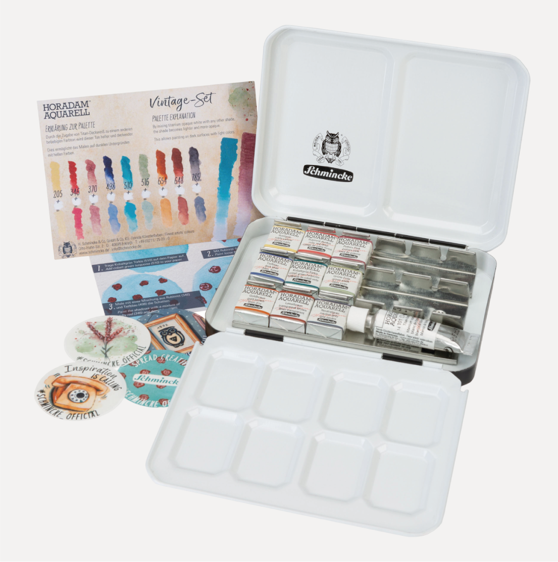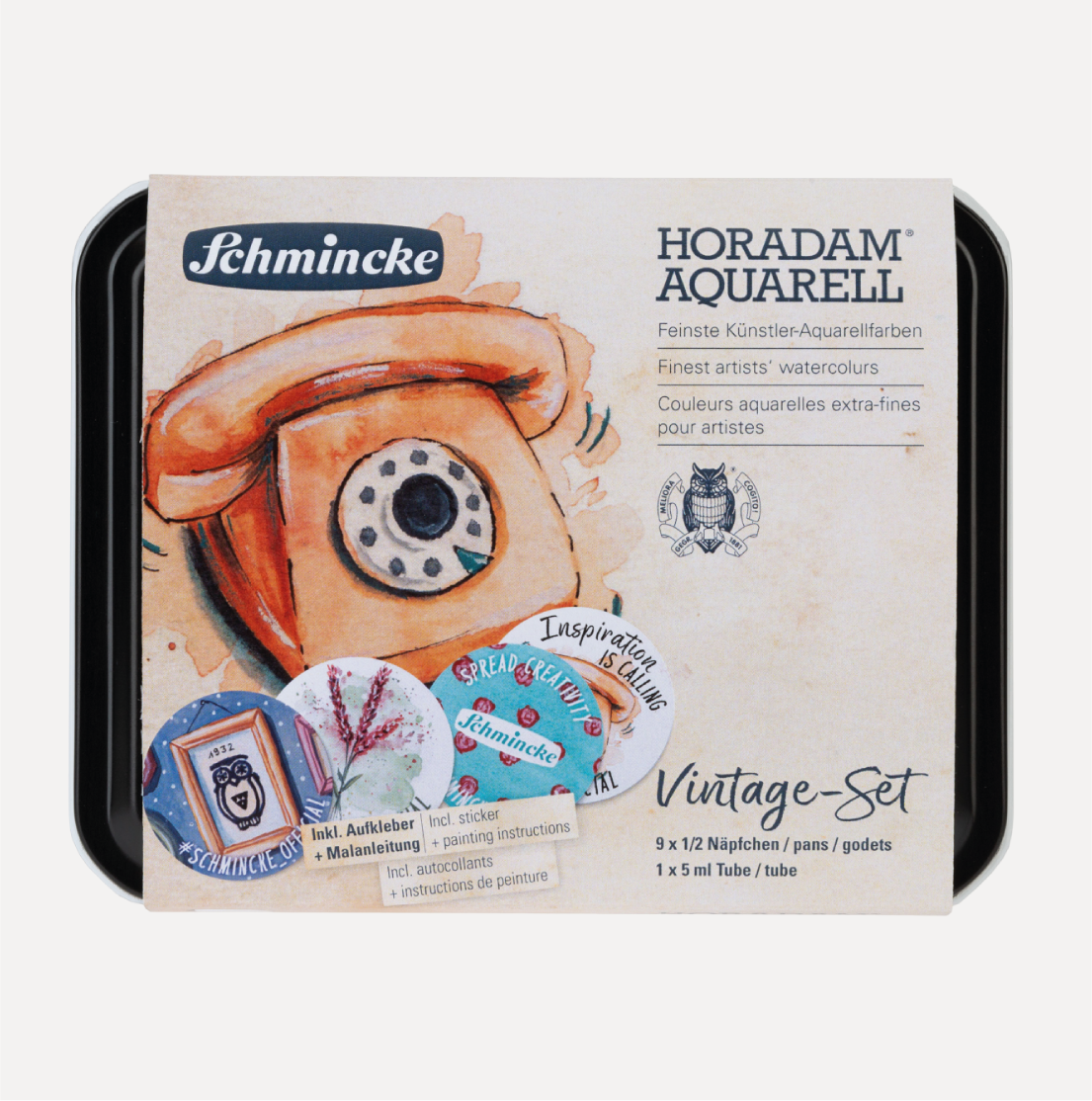 SCHMINCKE Colori Acquerello Horadam VINTAGE Set. 10 colori a tema vintage! All’interno di questa confezione di metallo troverai 9 colori nel formato mezzo godet e 1 colore in tubetto da 5ml.