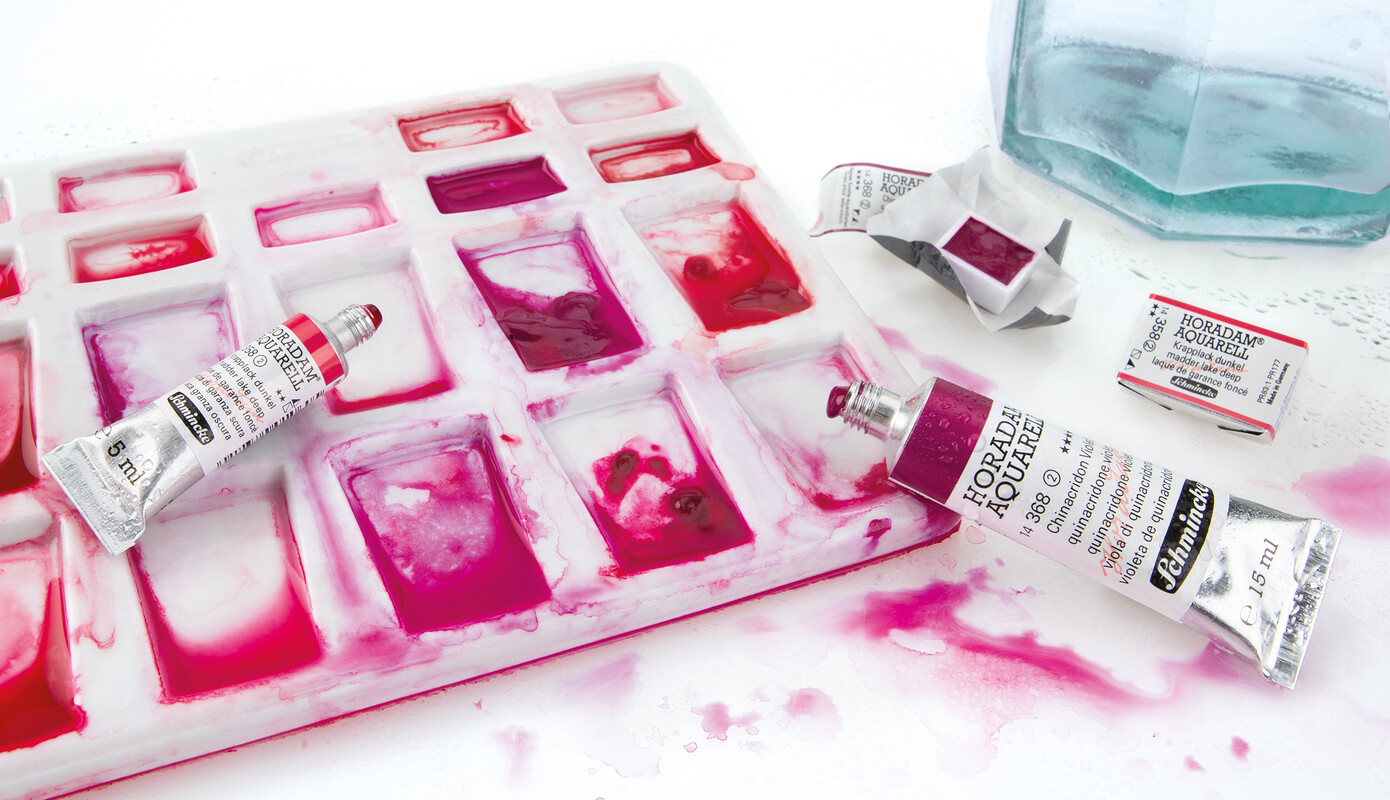 Le due file nella parte anteriore della tavolozza comprendono degli scomparti di forma trapezoidale, leggermente inclinati per permettere l’accumulo del colore diluito.