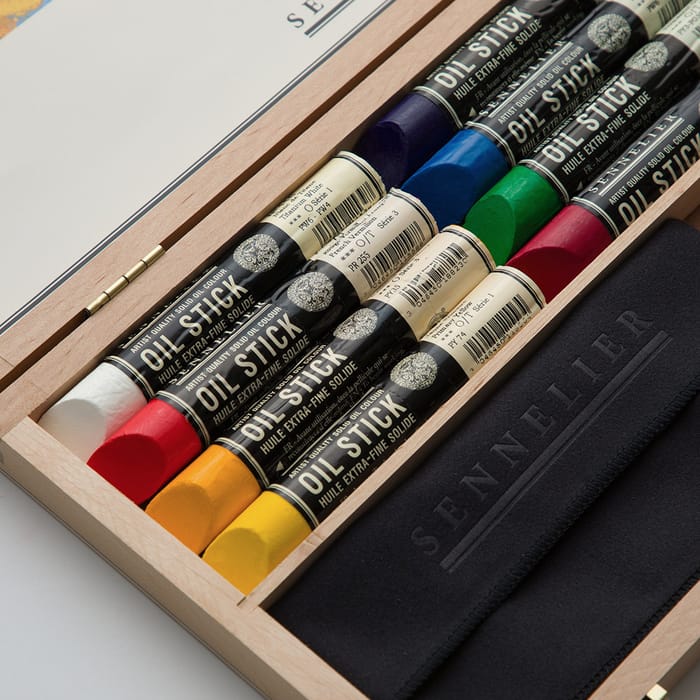 SENNELIER Oil Stick Cassetta in legno 12 Colori + Accessori. Hanno la forma di un pastello ma sono colori ad Olio Extrafine in tutto e per tutto! creati con pigmenti di altissima qualità possiedono toni forti e compatti. Allarga il tuo orizzonte della pittura ad olio!