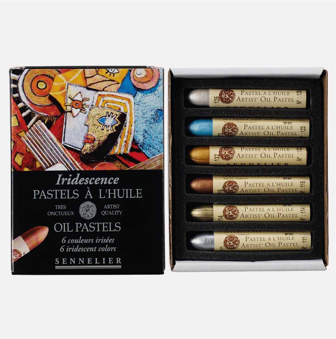 +SENNELIER Pastel à l’Huile Set 6 Pastelli ad Olio Colori IRIDESCENTI. Sono pastelli creati con pigmenti ad altissima qualità, toni forti e compatti. La confezione contiene 6 pastelli dalla tonalità iridescente.