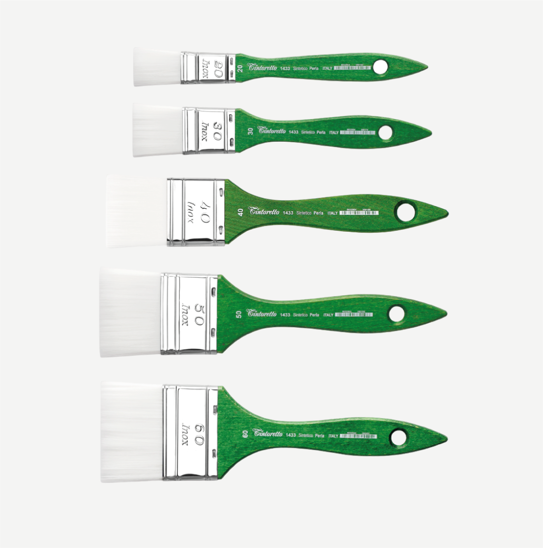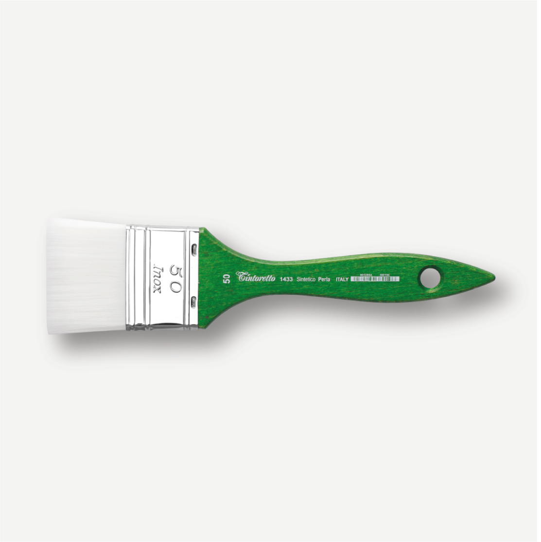 Tintoretto Pennellessa seie 1433, in pelo sintetico Perla. Ghiera in acciaio INOX e manico di legno verniciato verde a buratto, completamente waterproof.