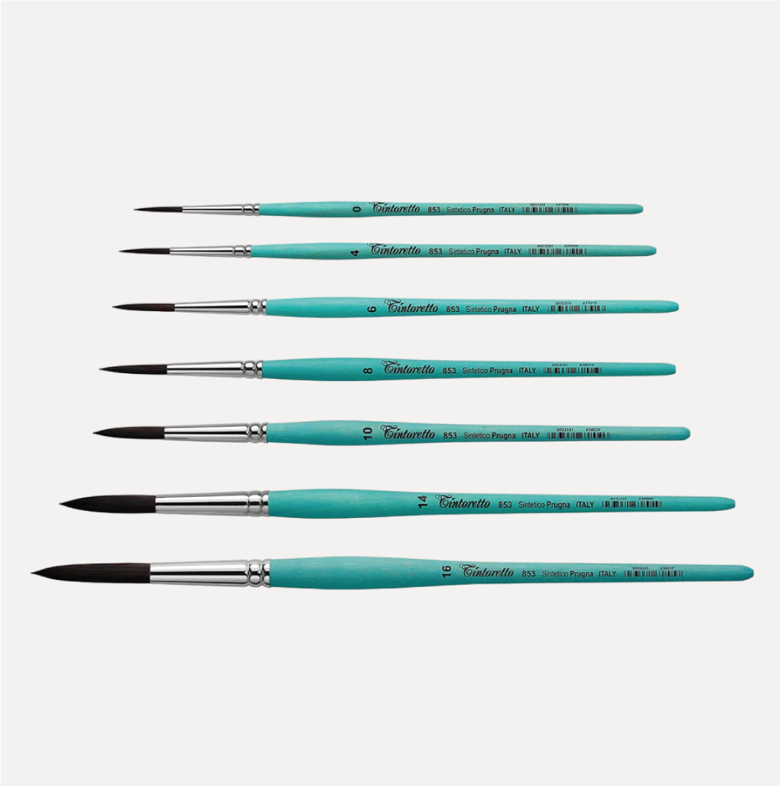 TINTORETTO Pennello Sintetico Prugna 853 – Linea Acquamarina. Punta tonda in pelo sintetico allungato, resistente ed elastico per la massima precisione! 100% Cruelty free, è perfetto per l’acquerello, ma ottimo anche per colori più cremosi come Tempera e Acrilico. Disponibile in 9 misure.