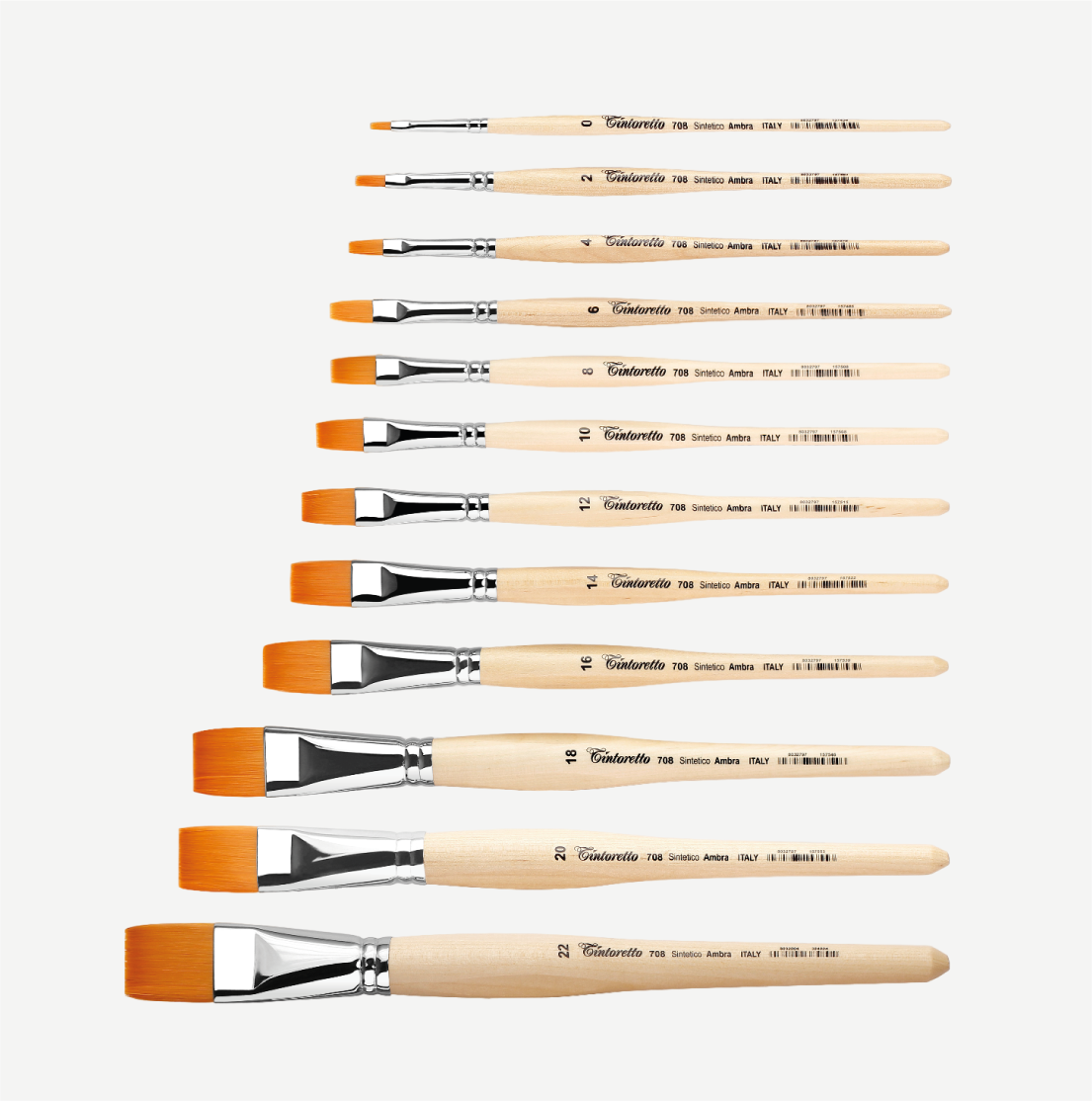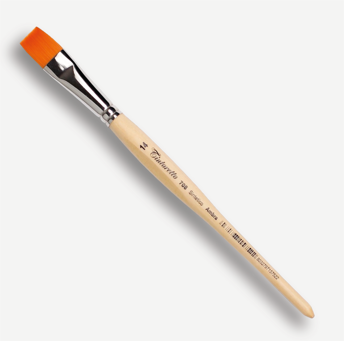 TINTORETTO Pennello Serie 708 – Pennello piatto, pelo sintetico Ambra. Ghiera in ottone nichelato e manico corto esagonale di legno verniciato trasparente. Ideale per qualsiasi tecnica!!