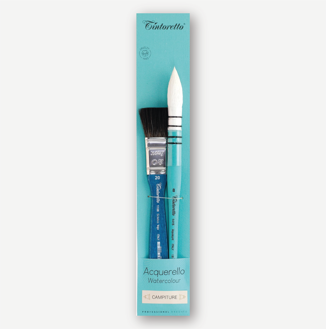 TINTORETTO Set Pennelli per Acquerello CAMPITURE. All’interno della confezione si trovano 2 pennelli parliamo delle serie: 1415 e 1108. Sono perfetti per campiture e sono 100% cruelty free.