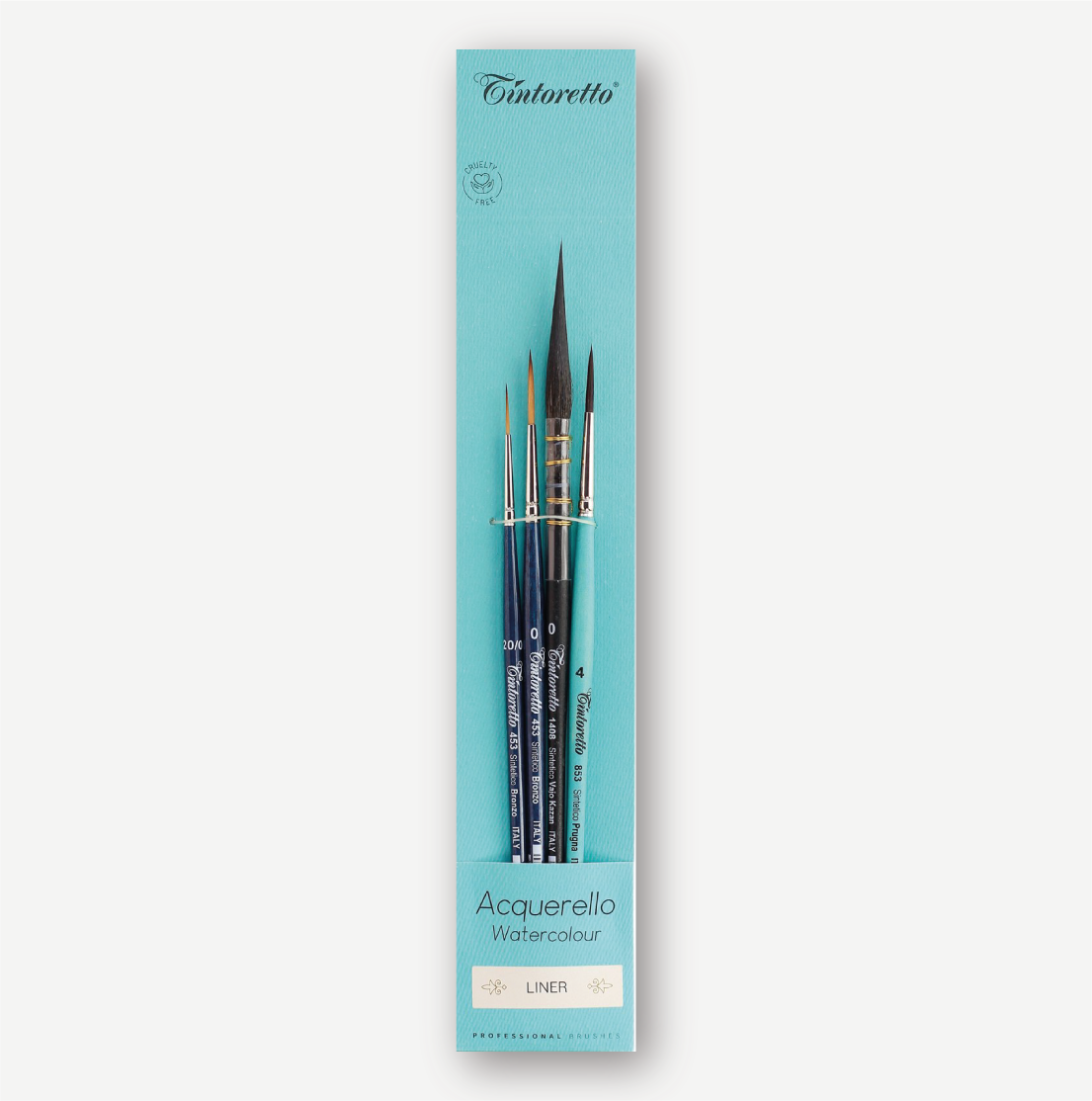TINTORETTO Set Pennelli LINER per Acquerello. All’interno della confezione si trovano 4 pennelli parliamo delle serie: 453 (2 pennelli), 853 e 1408. Sono perfetti per realizzare dettagli fini e sono 100% cruelty free.