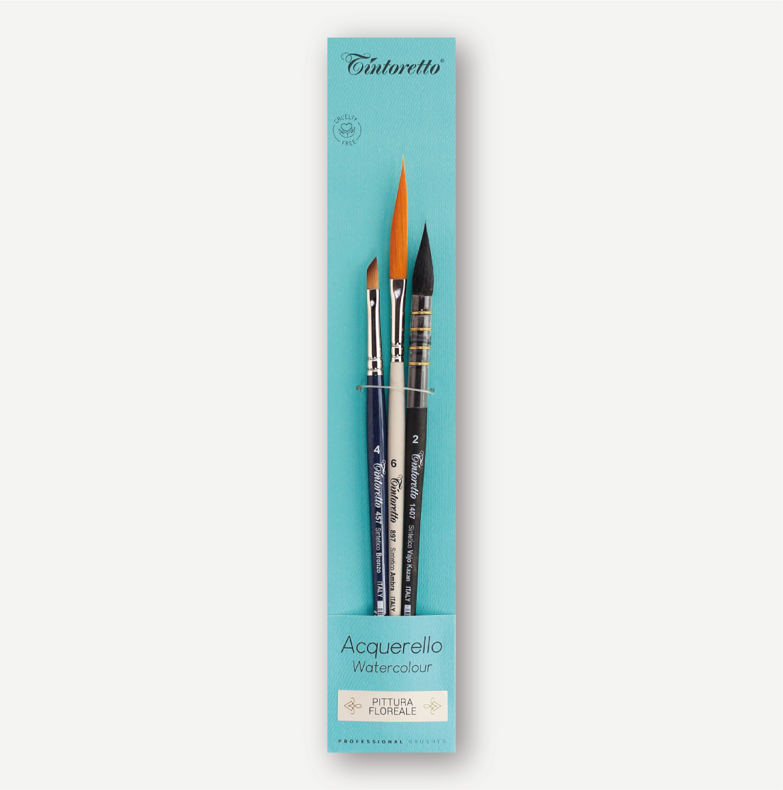 TINTORETTO Set Pennelli per Acquerello Pittura FLOREALE. All’interno della confezione si trovano 3 pennelli parliamo delle serie: 1401, 897 e 457. Sono studiati appositamente per illustrazioni floreali e sono 100% cruelty free.