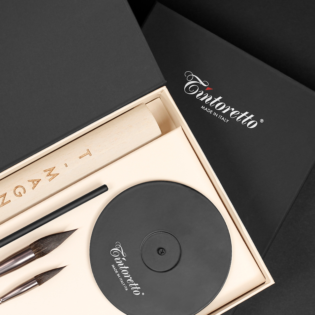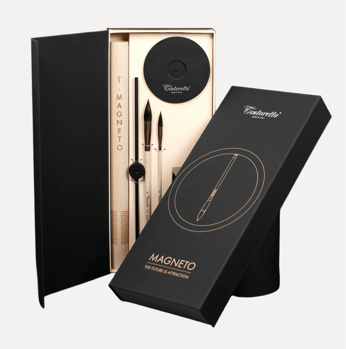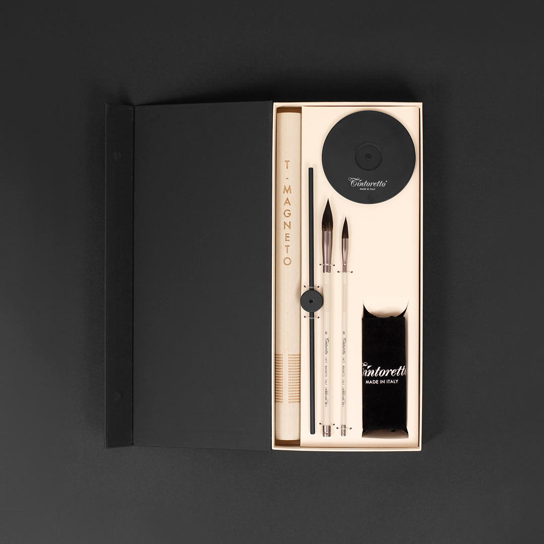 TINTORETTO T-Magneto Kit 2 Pennelli + Supporto. Questo magnifico Set oltre a due tra le misure più richieste, la 0 e la 6, contiene l’espositore T-Magneto, il perfetto supporto per i tuoi pennelli magnetici. La ricercatezza della custodia, minimal ed elegante, si unisce alla praticità, rendendo questo kit il perfetto regalo per tutti gli acquarellisti, esperti e principianti. Lasciati attrarre dal futuro!