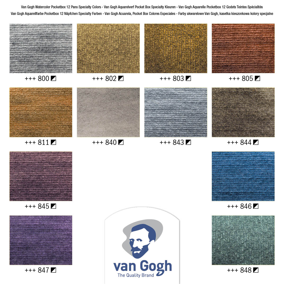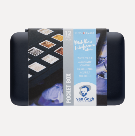 VAN GOGH Acquarello Set 12 Mezzi Godet Colori Metallici. Set in Plastica con tavolozza, 12 mezzi godet (colori Metallici e Iridescenti) e pennello tascabile da viaggio. Il set si adatta perfettamente alla grandezza della mano e alle tasche il che lo rende pratico per pitture en-plenair.