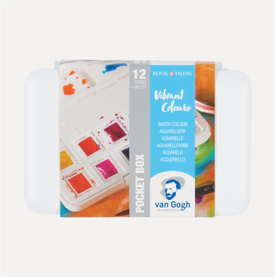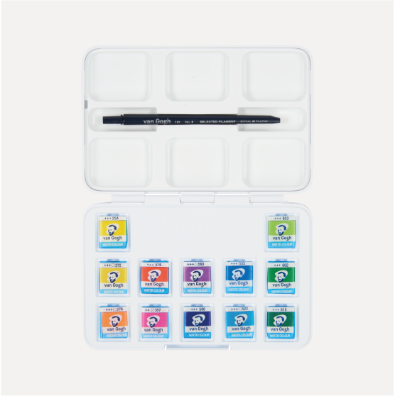 VAN GOGH Acquarello set 12 Mezzi Godet Colori Vivaci. Set in Plastica con tavolozza, 12 mezzi godet (colori Vivaci) e pennello tascabile da viaggio. Il set si adatta perfettamente alla grandezza della mano e alle tasche il che lo rende pratico per pitture en-plenair.