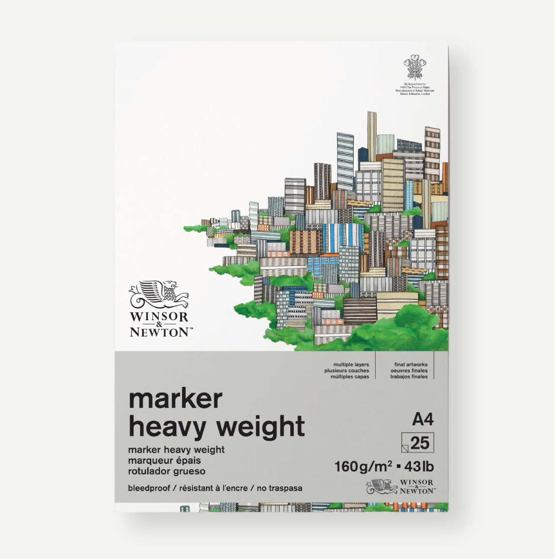 Il blocco di carta per Marker di Winsor & Newton, è composto da 20 fogli di carta trattata in modo speciale con una grammatura di 160 g/mq. Questa carta offre prestazioni ottimali, resistendo a diversi strati di colore.