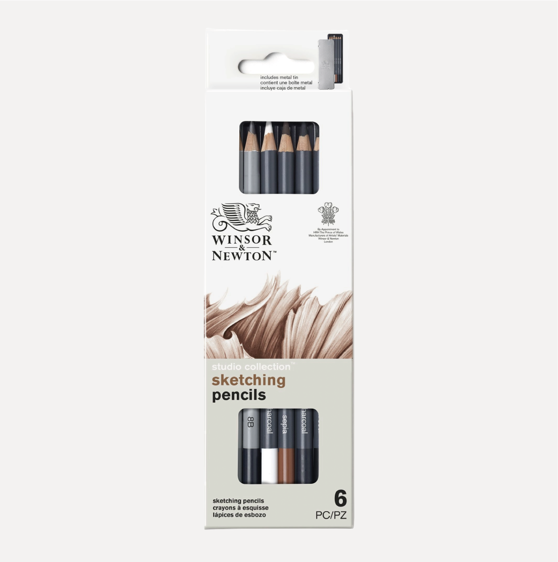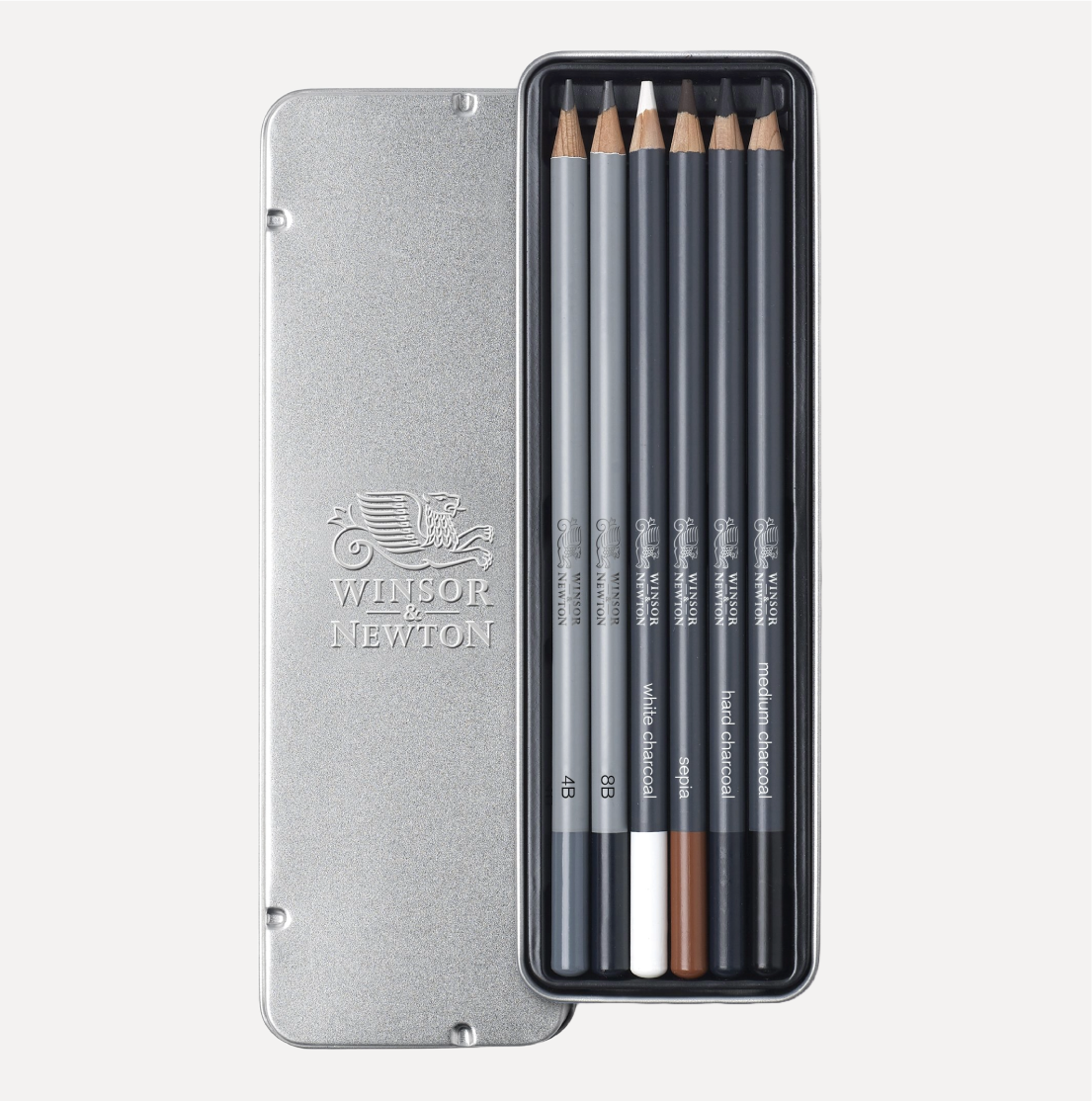 WINSOR & NEWTON Set da 6 matite Schizzo. Confezione con assortimento indispensabile per schizzi, composto da astuccio in metallo, 6 Matite indispensabili per i tuoi schizzi, Grafite 4B – 8B, Gesso Bianco, Pietra Nera, Carboncino e Seppia.