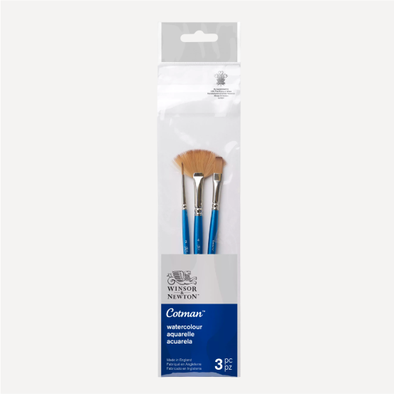 WINSOR & NEWTON Set di 3 Pennelli Cotman. Le fibre miste di questi pennelli offrono un’eccellente elasticità e un carico di colore superiore! Nel set sono inclusi un pennello Tondo n°2, un pennello Piatto n°6 e un pennello a Ventaglio n°4.