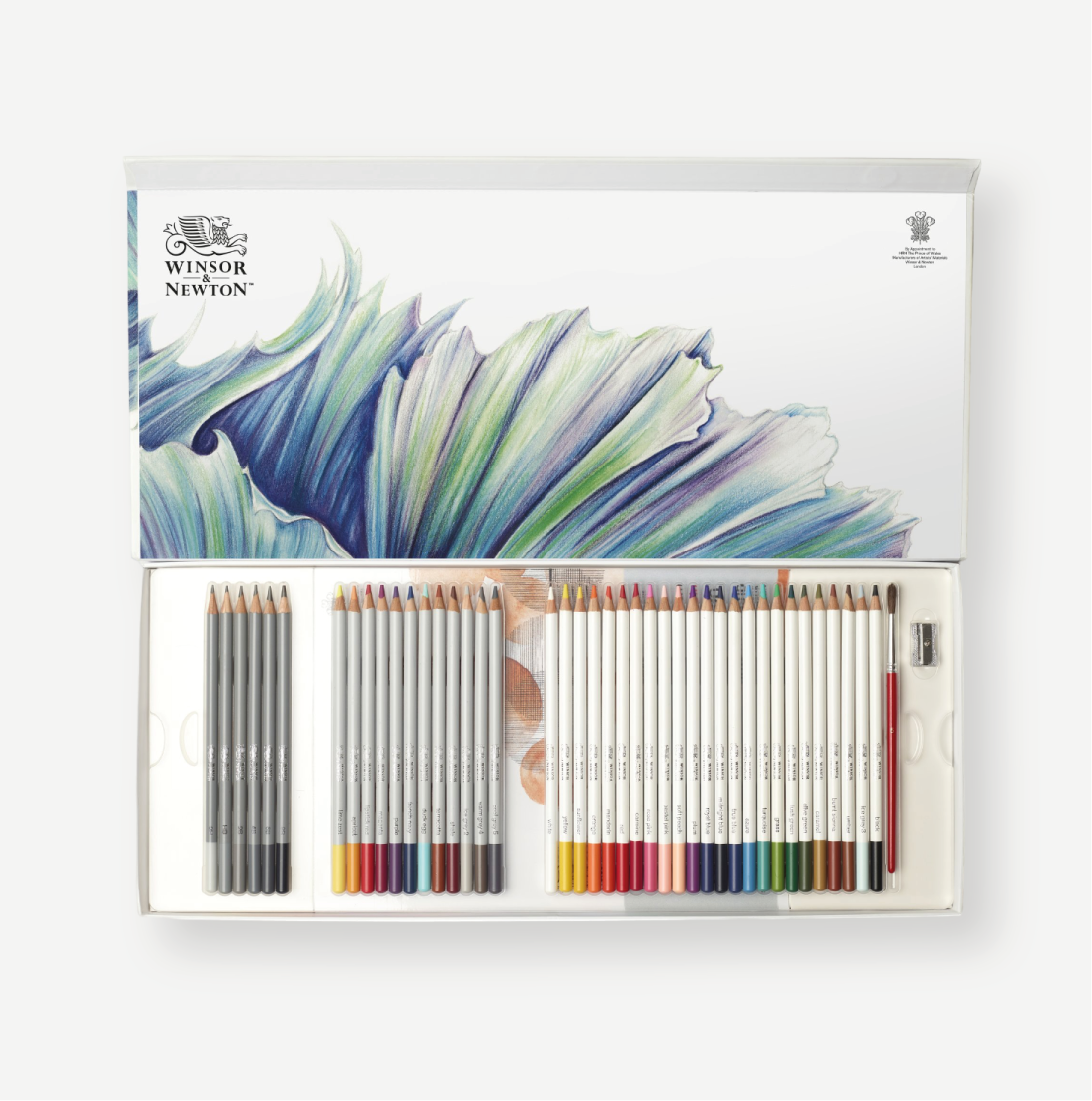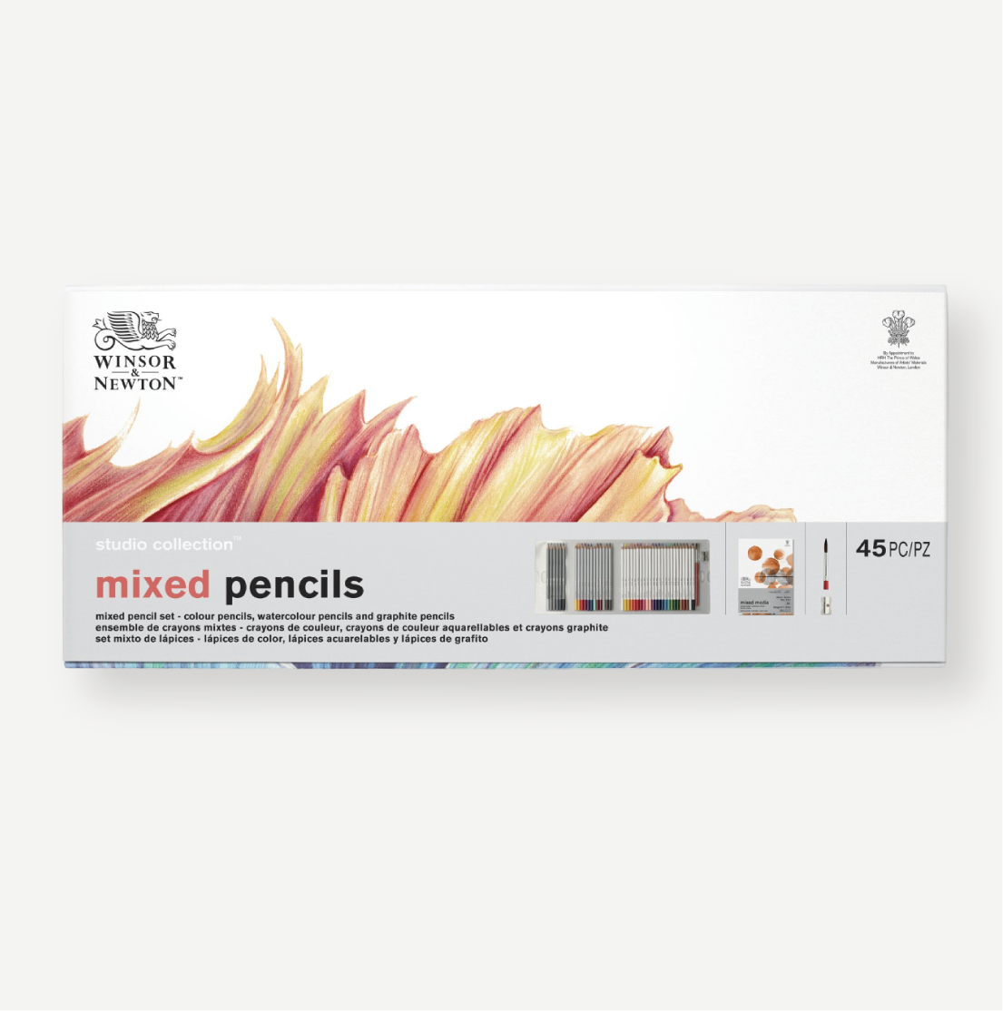 WINSOR & NEWTON Studio Collection Matite miste set 45 pezzi. Winsor & Newton Studio Collection ti permette di sperimentare tutte le tecniche del disegno a matita. Il set infatti, contiene matite a Grafite, matite colorate e matite ad acquerello, il tutto accompagnato da un blocco Mixed Media e un pennello.
